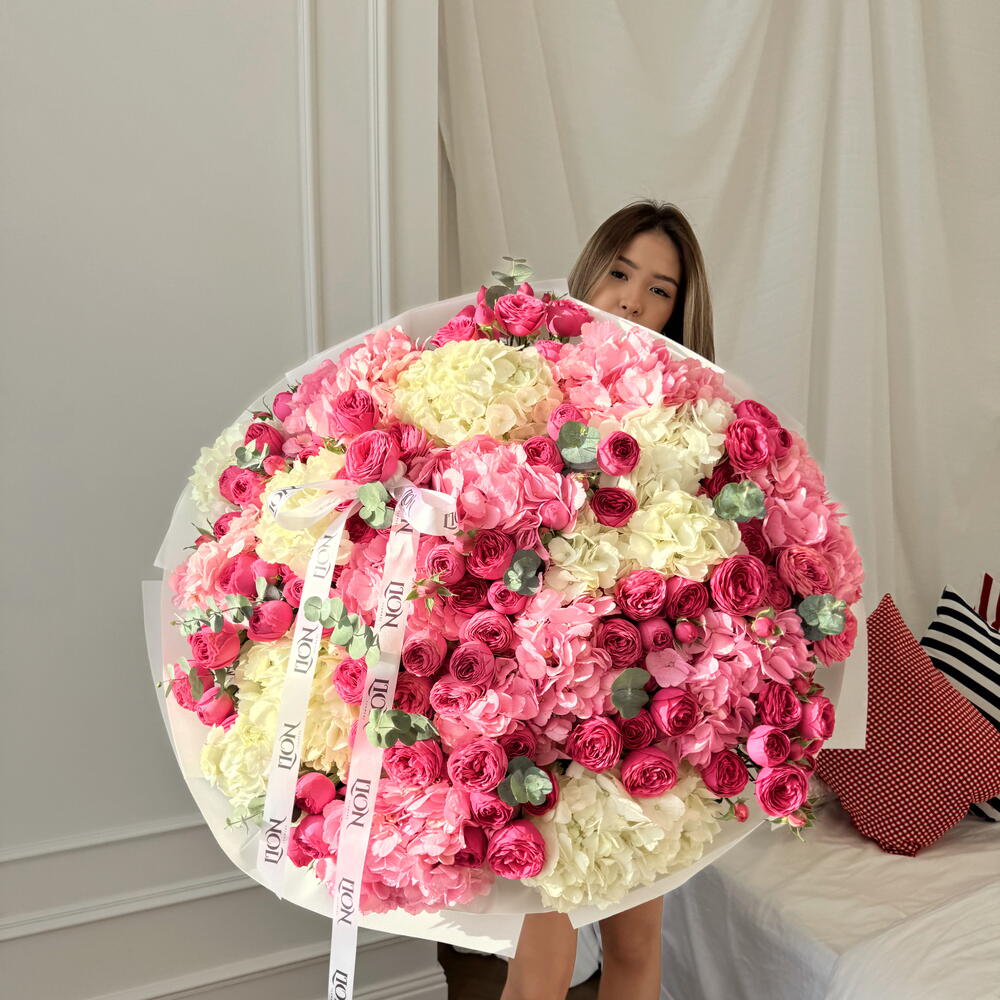 Эвкалипт - 10 шт. гортензии - 16 шт. пионовидные кустовые розы - 20 шт.
