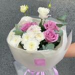 Хризантема кустовая - 1 шт. Эвкалипт - 1 шт. Роза - 3 шт. Эустома - 1 шт. Лента атласная - 1 шт. Георгина - 1 шт. Фоамиран (упаковка) - 3 шт. Калька упаковка - 3 шт.