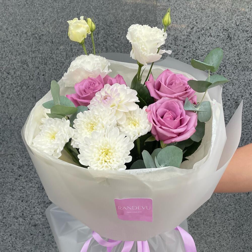 Хризантема кустовая - 1 шт. Эвкалипт - 1 шт. Роза - 3 шт. Эустома - 1 шт. Лента атласная - 1 шт. Георгина - 1 шт. Фоамиран (упаковка) - 3 шт. Калька упаковка - 3 шт.