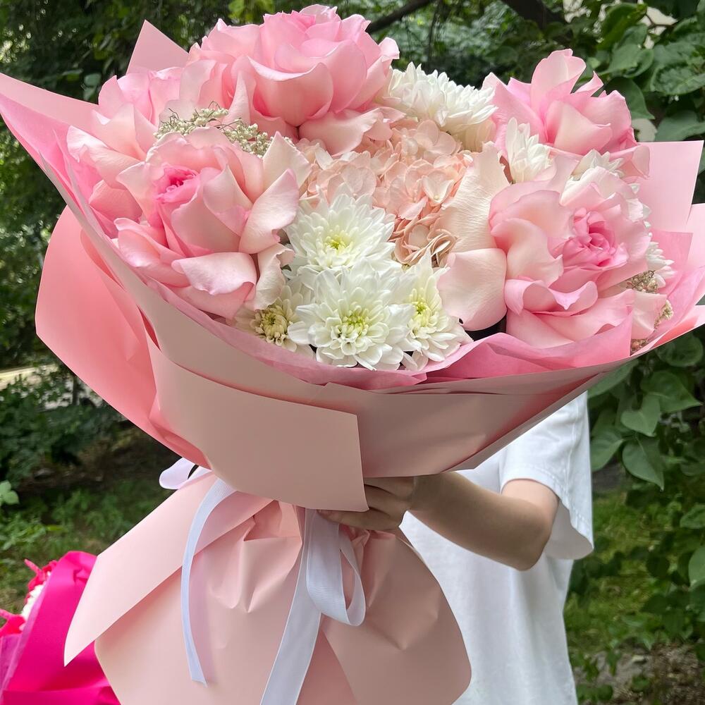 Озотамнус - 2 шт. Хризантема кустовая - 3 шт. Гортензия розовая - 1 шт. розы розовые - 5 шт.