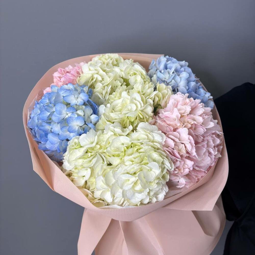 Букет из 7шт гортензий микс с оформлением. Этот букет создан, чтобы напоминать о самых тёплых чувствах. Он наполнен свежестью, гармонией и лёгкостью, словно дыхание весны. Подарите его — и пусть день станет чуть добрее и светлее