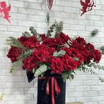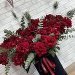 Лента - 2 шт. Эвкалипт - 11 шт. Французская роза - 35 шт. Бархатная коробка - 1 шт. Оазис флористический - 2 шт. павлинее перо - 5 шт.