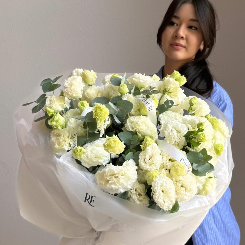 Стильный моно-букет в холодных тонах — белоснежные цветы с акцентами зелени и эвкалипта. Современно, сдержанно и элегантно.