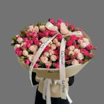 Букет из малиновых и кремовых кустовых роз, оформленный фирменной брендированной лентой. Идеален для стильного и запоминающегося подарка.