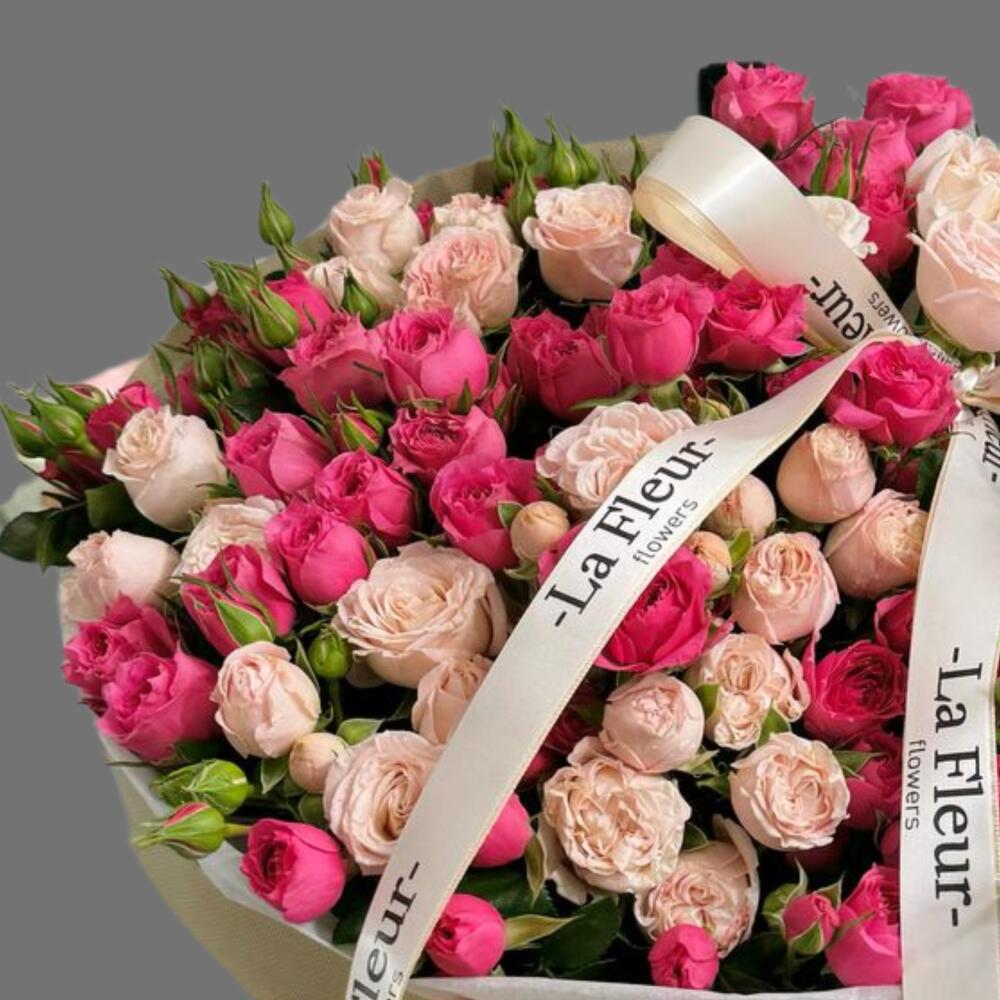 Букет из малиновых и кремовых кустовых роз, оформленный фирменной брендированной лентой. Идеален для стильного и запоминающегося подарка.