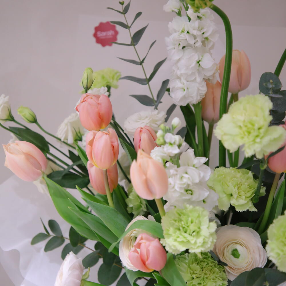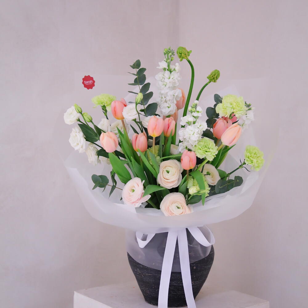 Маттиола - 3 шт. Тюльпан - 11 шт. Эвкалипт - 1 шт. Гвоздика - 5 шт. Эустома - 4 шт. Орнитогалум - 2 шт. Ранункулюс - 5 шт.