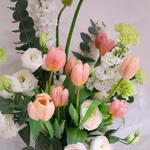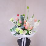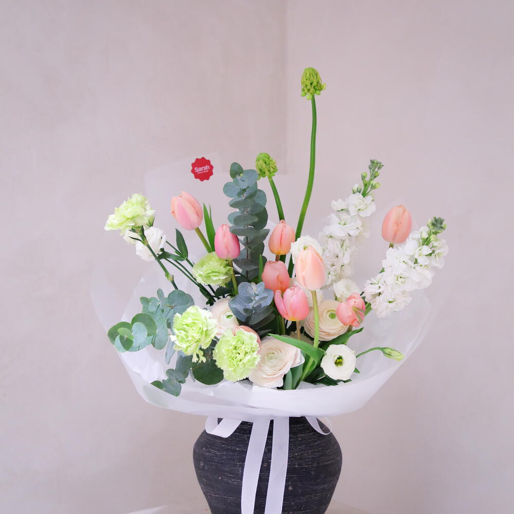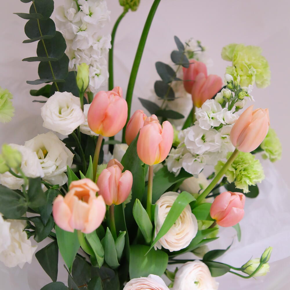 Маттиола - 2 шт. Тюльпан - 9 шт. Эвкалипт - 1 шт. Гвоздика - 4 шт. Эустома - 4 шт. Орнитогалум - 2 шт. Ранункулюс - 3 шт.