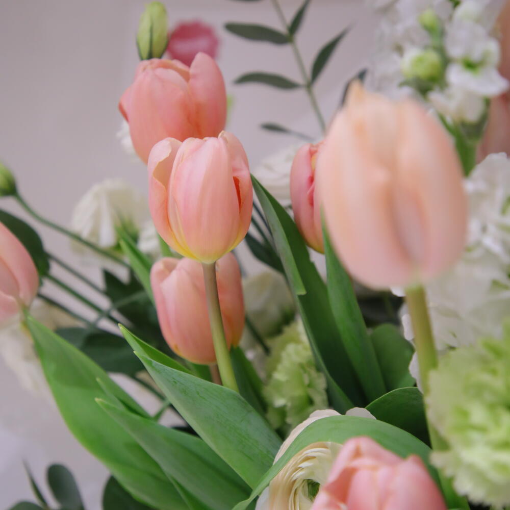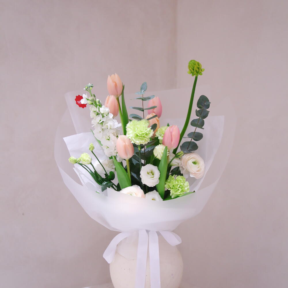 Маттиола - 1 шт. Тюльпан - 5 шт. Эвкалипт - 1 шт. Гвоздика - 3 шт. Эустома - 3 шт. Орнитогалум - 1 шт. Ранункулюс - 2 шт.