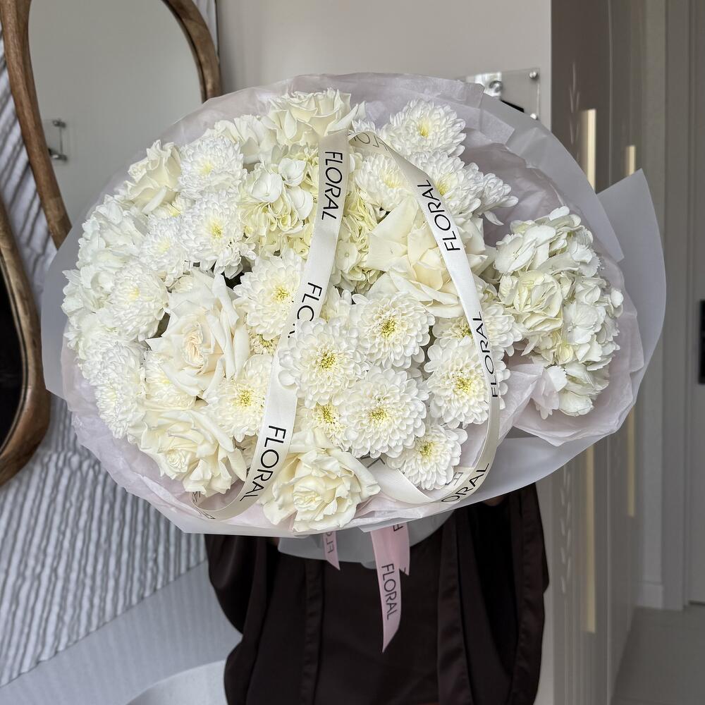 Очаровательный монобукет, состоящий из трех белоснежных гортензий, семи пышных роз чудесного розового оттенка и пяти шикарных премиум хризантем, станет прекрасным подарком на любое торжество. Это сочетание цветов символизирует нежность, любовь и утонченность. Букет послужит идеальным украшением для интерьера и будет дарить свежесть и аромат в течение долгого времени. Это идеальный выбор, если вы хотите произвести впечатление и показать свою заботу и внимание.