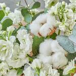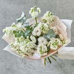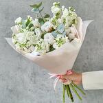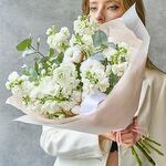 Маттиола - 5 шт. Хлопок - 5 шт. Эвкалипт - 1 шт. Лента атласная - 2 шт. бумага дизайнерская - 4 шт.