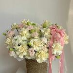 Красивые белые розы и нежны лизиантусы в стильной плетенной корзине. Хорошо подходит для подарков просто так и для особого повода.