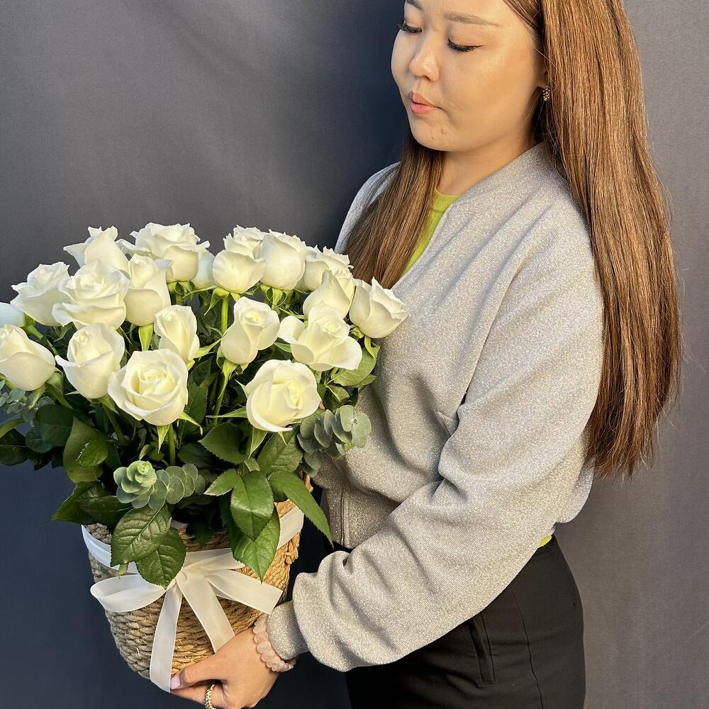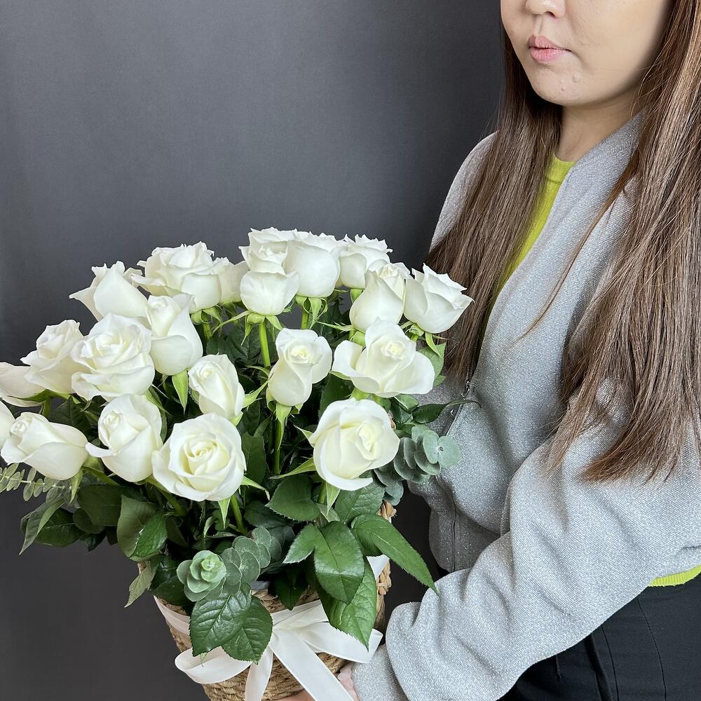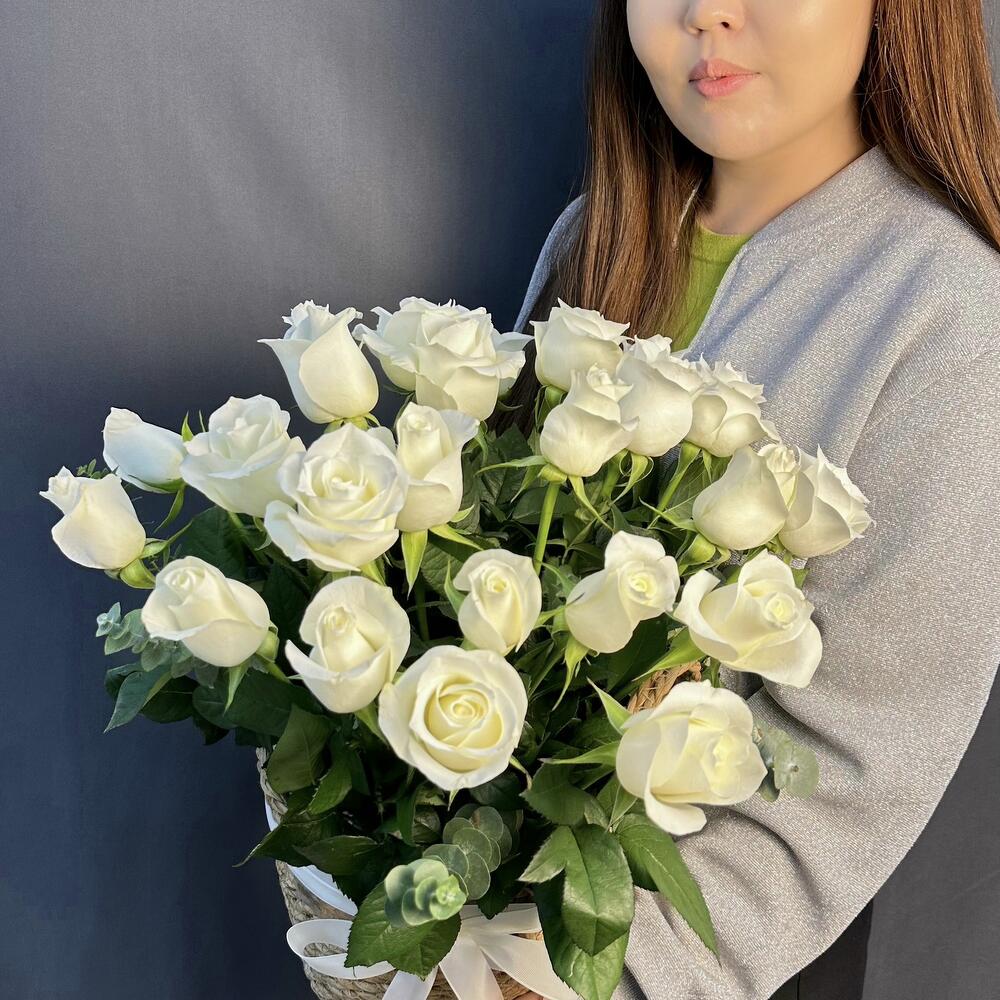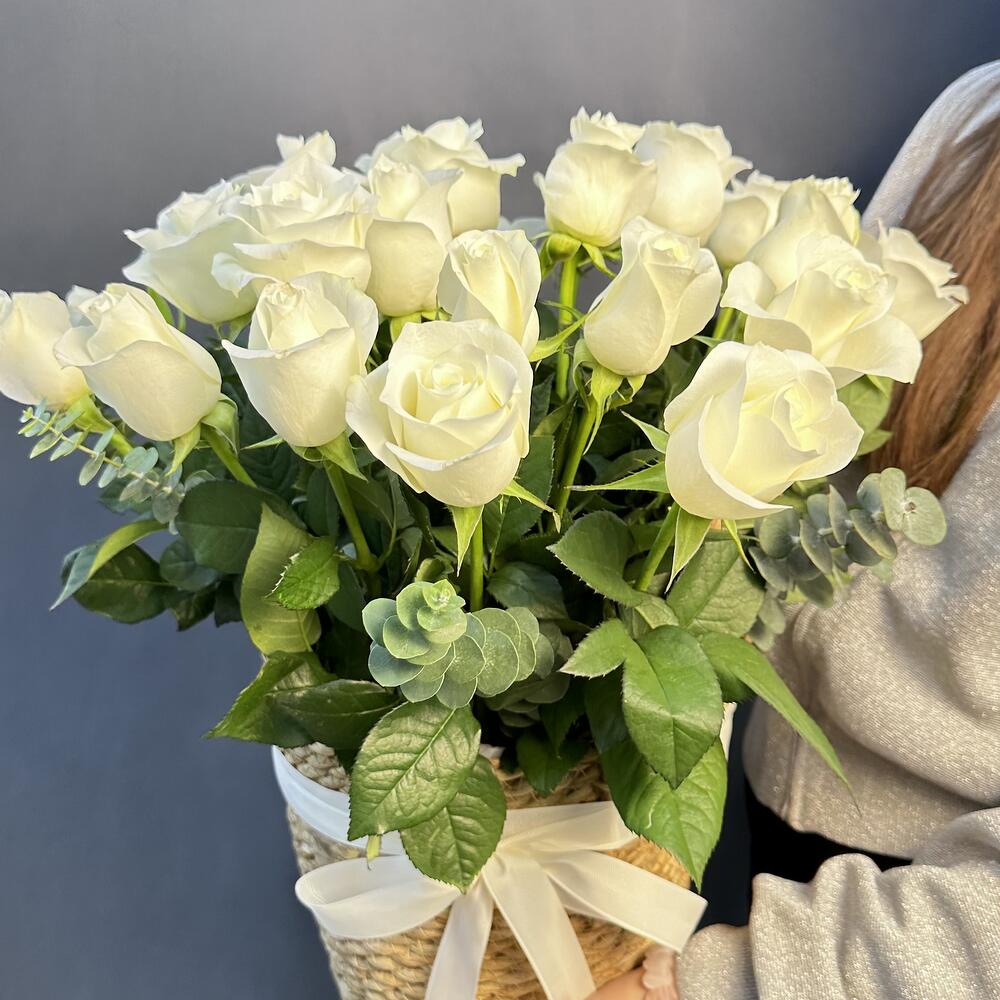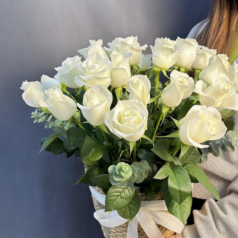 Эвкалипт - 5 шт. Лента атласная - 1 шт. Кашпо - 1 шт. белые розы - 25 шт.
