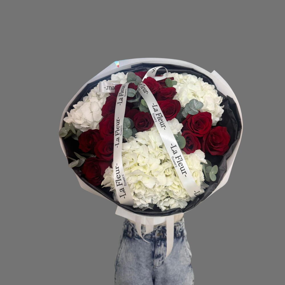 Гортензия - 3 шт. Эвкалипт - 1 шт. Роза - 15 шт. аква бумага - 1 шт.