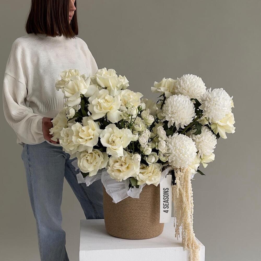 Букет “Белое совершенство” – это воплощение чистоты и элегантности в каждом лепестке. Сочетание белоснежных хризантем, роскошных роз и нежных бутонов создает атмосферу утонченной роскоши и гармонии. Идеальный выбор для особых случаев: свадьба, юбилей или знак искреннего восхищения. Этот букет символизирует начало чего-то нового, светлого и значимого, его можно преподнести как дар, который подчеркнет важность момента и оставит незабываемое впечатление. “Белое совершенство” – это не просто цветы, это эмоции, выраженные через природную красоту.