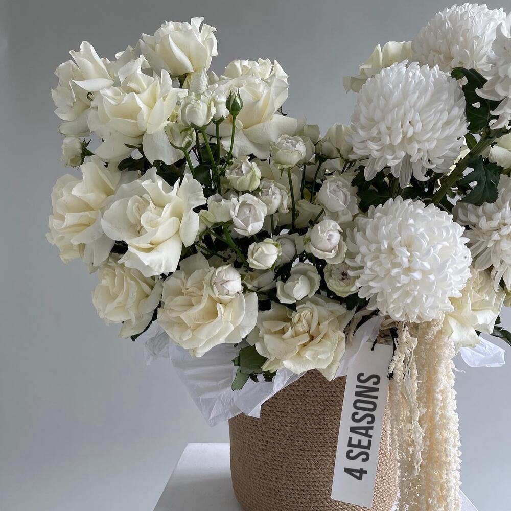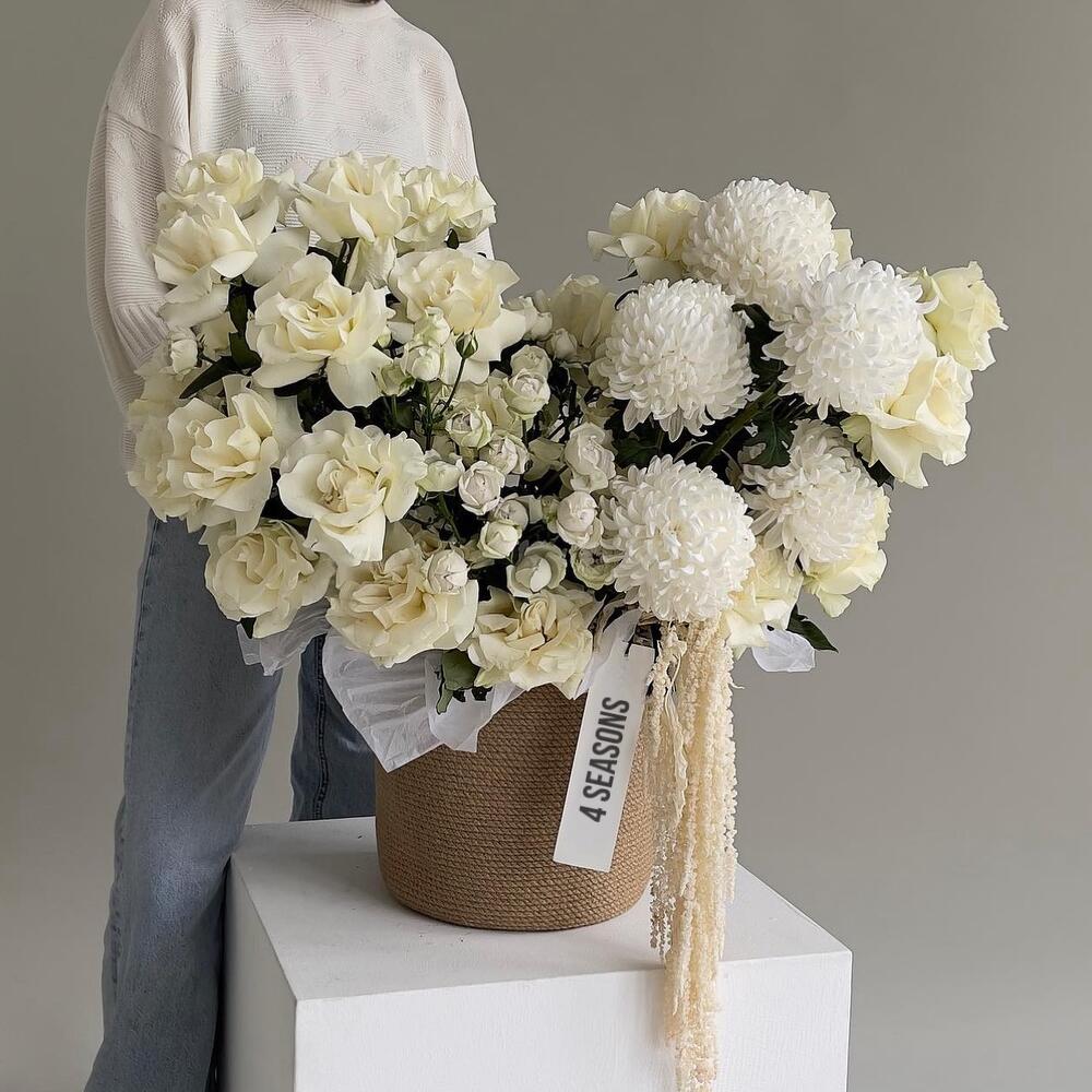 Кашпо - 1 шт. Роза пионовидная - 17 шт. Хризантема одноголовая - 5 шт. Оазис флористический - 2 шт. Дизайнерская упаковка - 4 шт. декоративная зелень - 1 шт. кустовые пионовидные розы - 7 шт.