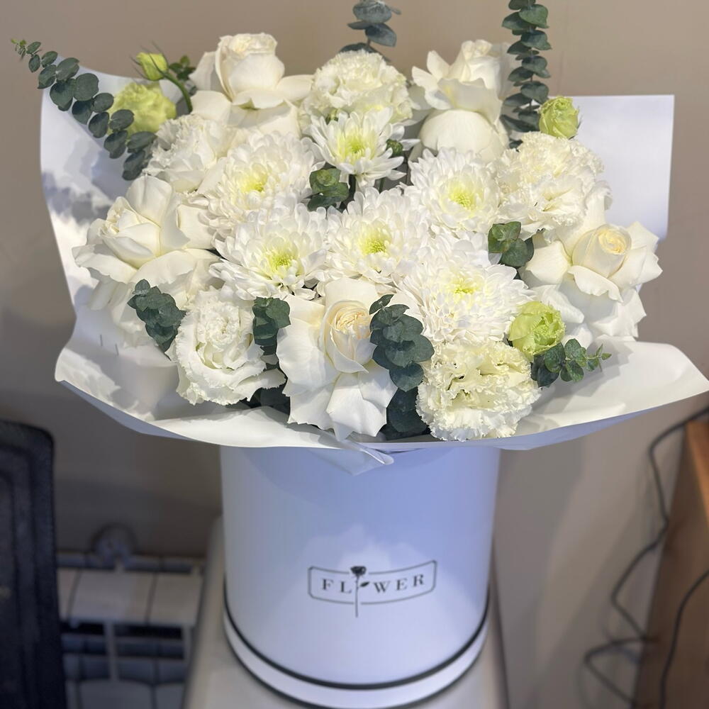 Хризантема кустовая - 1 шт. Эвкалипт - 2 шт. Роза - 5 шт. эустома белая - 2 шт.
