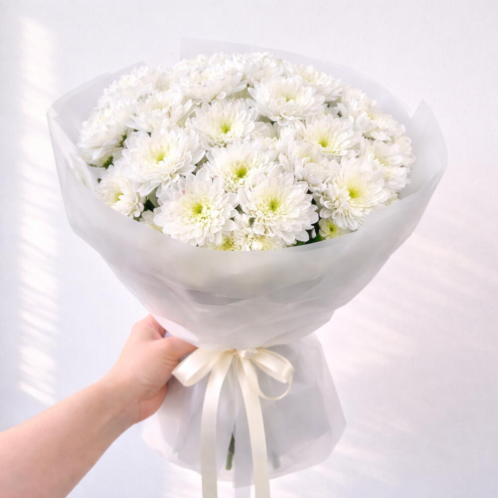 Белоснежная хризантема — это утончённый монобукет, созданный для ценителей чистоты форм, света и спокойной элегантности. Пышные кустовые хризантемы с идеально белыми лепестками формируют объёмную и гармоничную композицию, которая выглядит свежо, аккуратно и очень благородно. Такой букет из белых хризантем универсален: он подойдёт для поздравления, знака внимания, признания в тёплых чувствах или украшения интерьера. Белые хризантемы символизируют искренность, уважение и душевное тепло, поэтому этот монобукет всегда будет уместным и запоминающимся подарком.