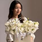 Композиция из воздушных белых эустом, украшенная лентами с логотипом Royal Flowers, оформленная в элегантную сумочку с ручками
