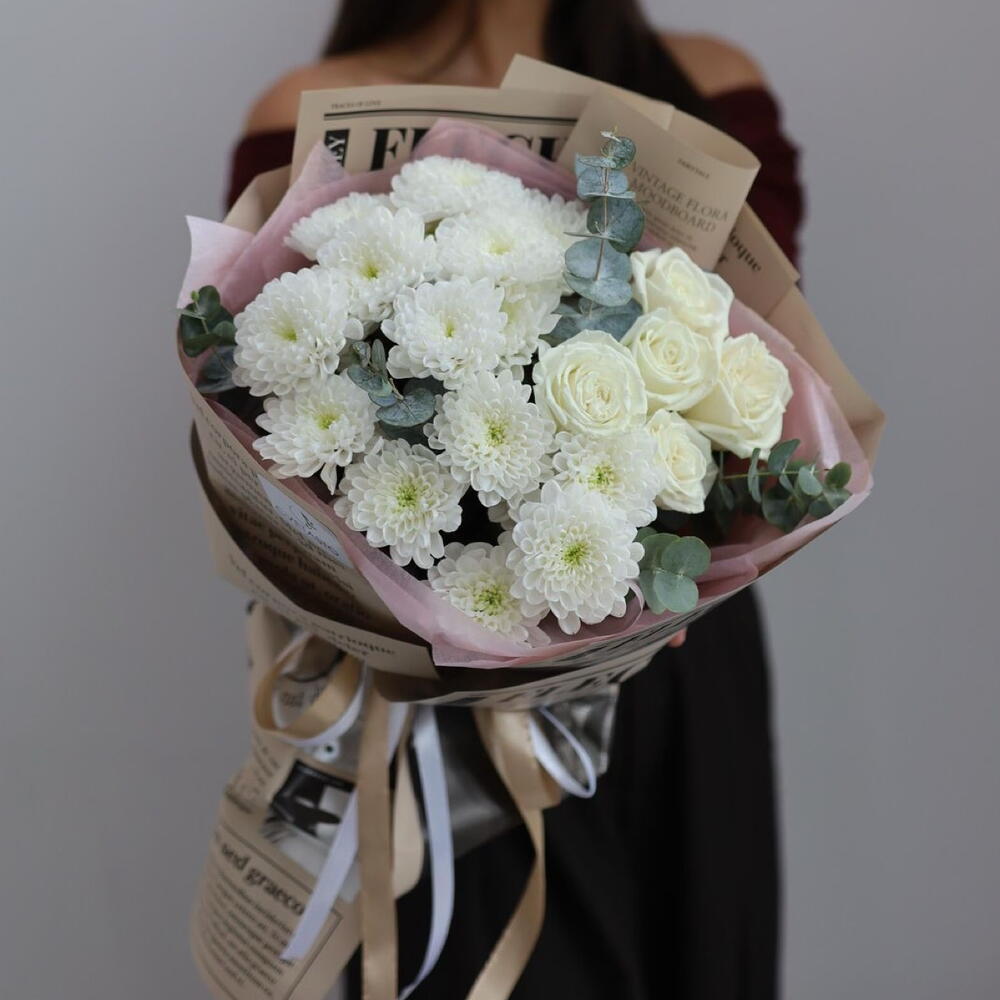 Хризантема кустовая - 3 шт. Эвкалипт - 5 шт. Роза - 5 шт.