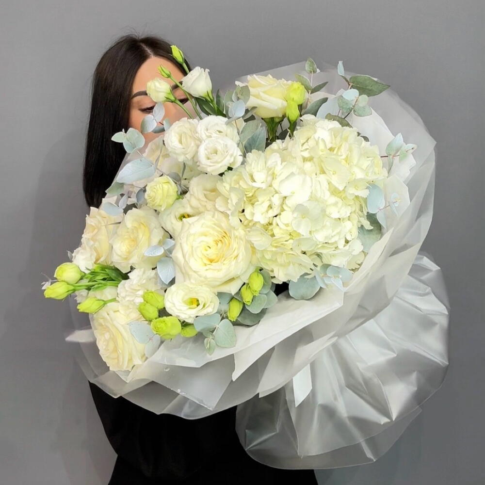 Нежный пышный евро-букет в белоснежных оттенках Отличный выбор для дня рождения, свидания или сюрприза без повода, для знакомства, для свадьбы 📏 Диаметр букета ~60–65 см 🎁 Красивая упаковка включена
