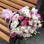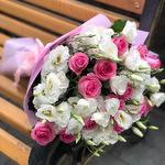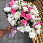 Роза розовая - 15 шт. эустома белая - 10 шт. Упаковка пленка матовая - 1 шт.