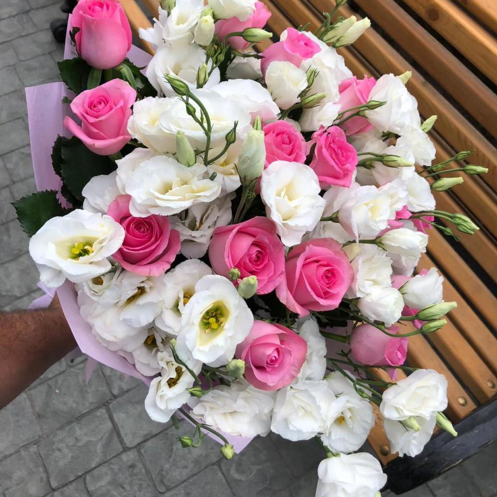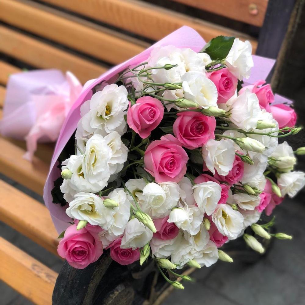 Роза розовая - 15 шт. эустома белая - 10 шт. Упаковка пленка матовая - 1 шт.