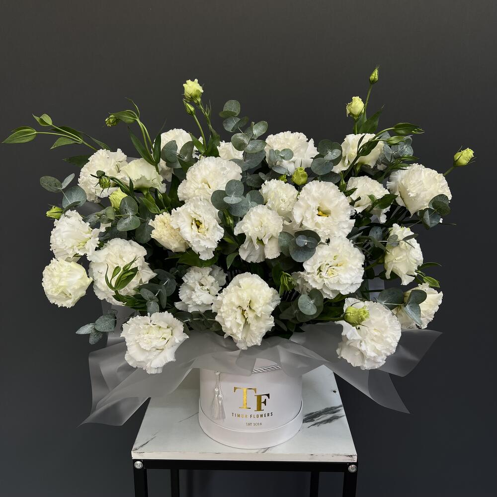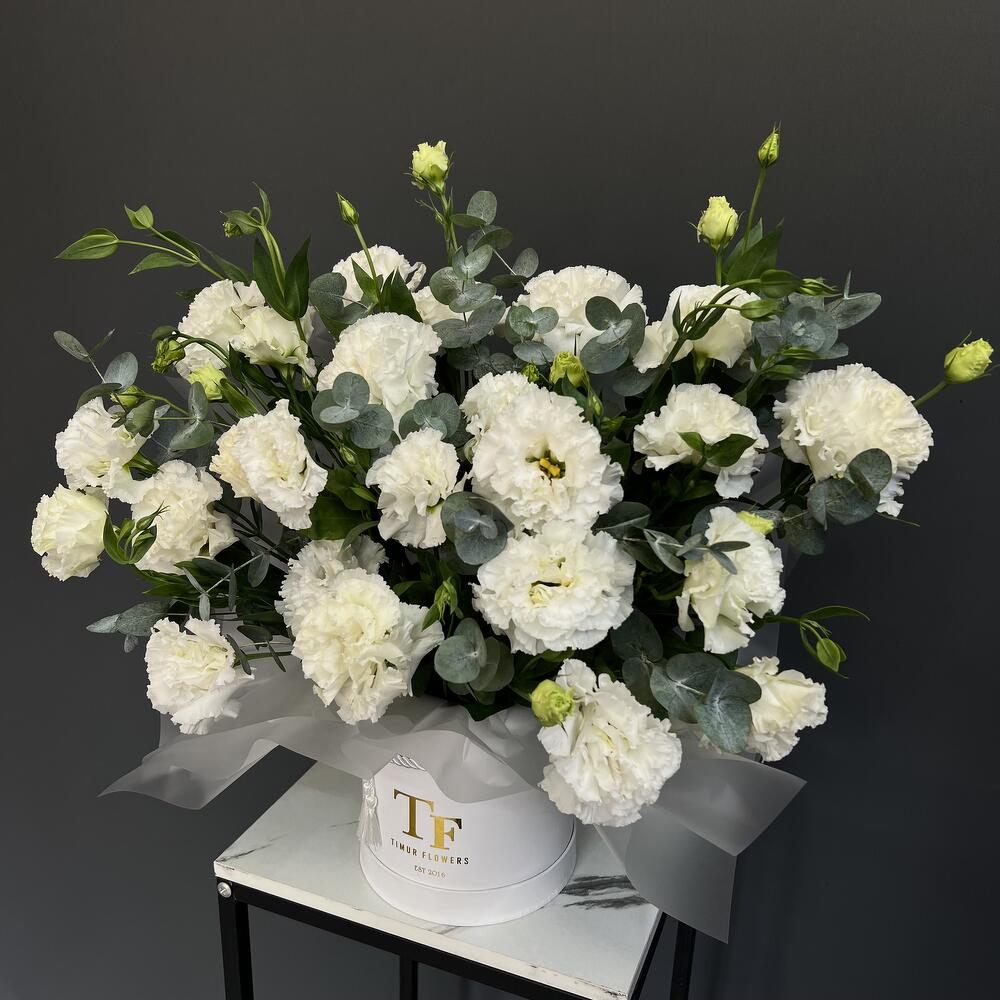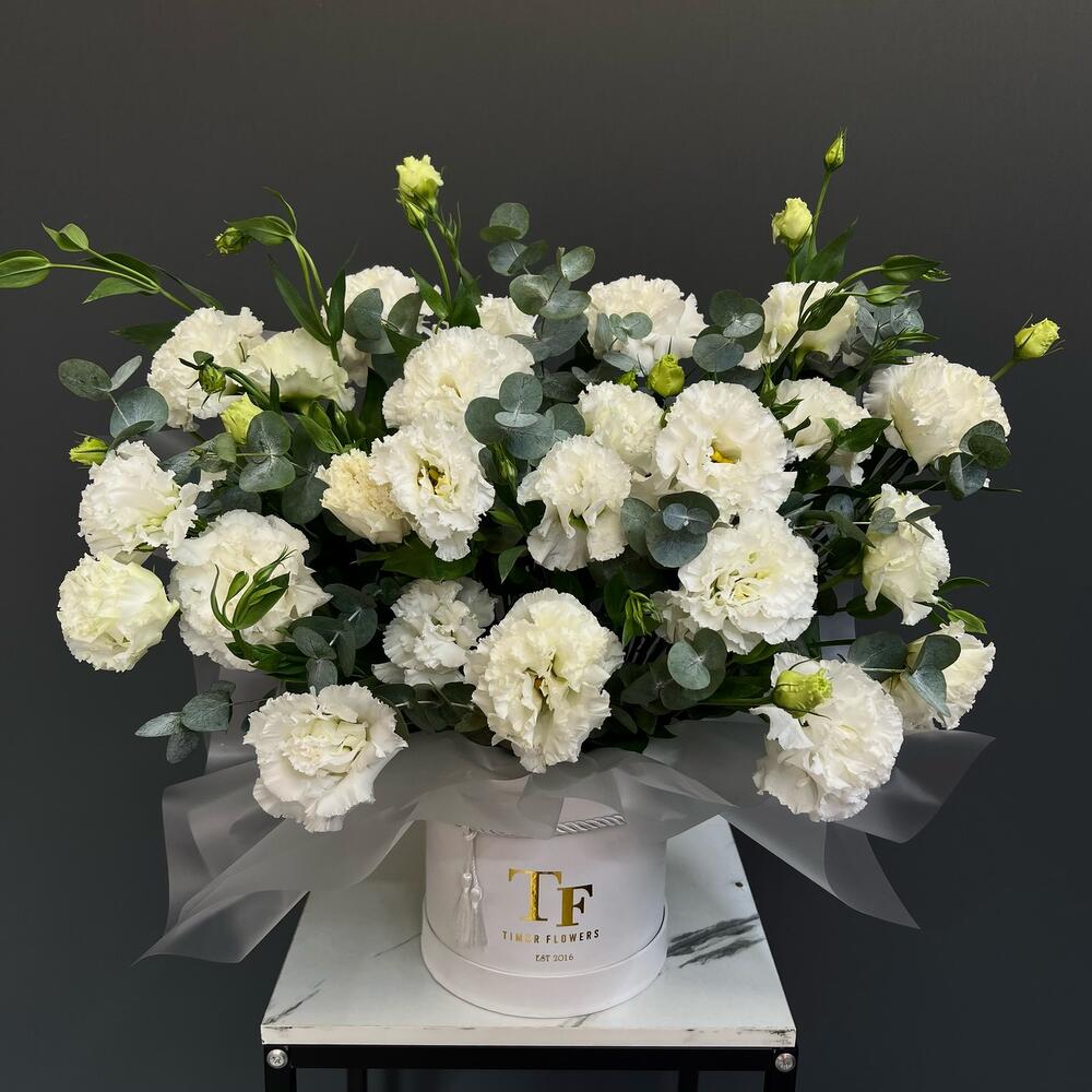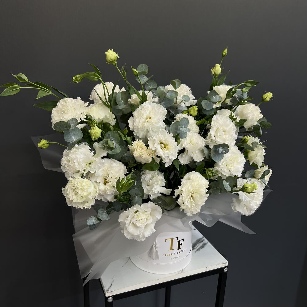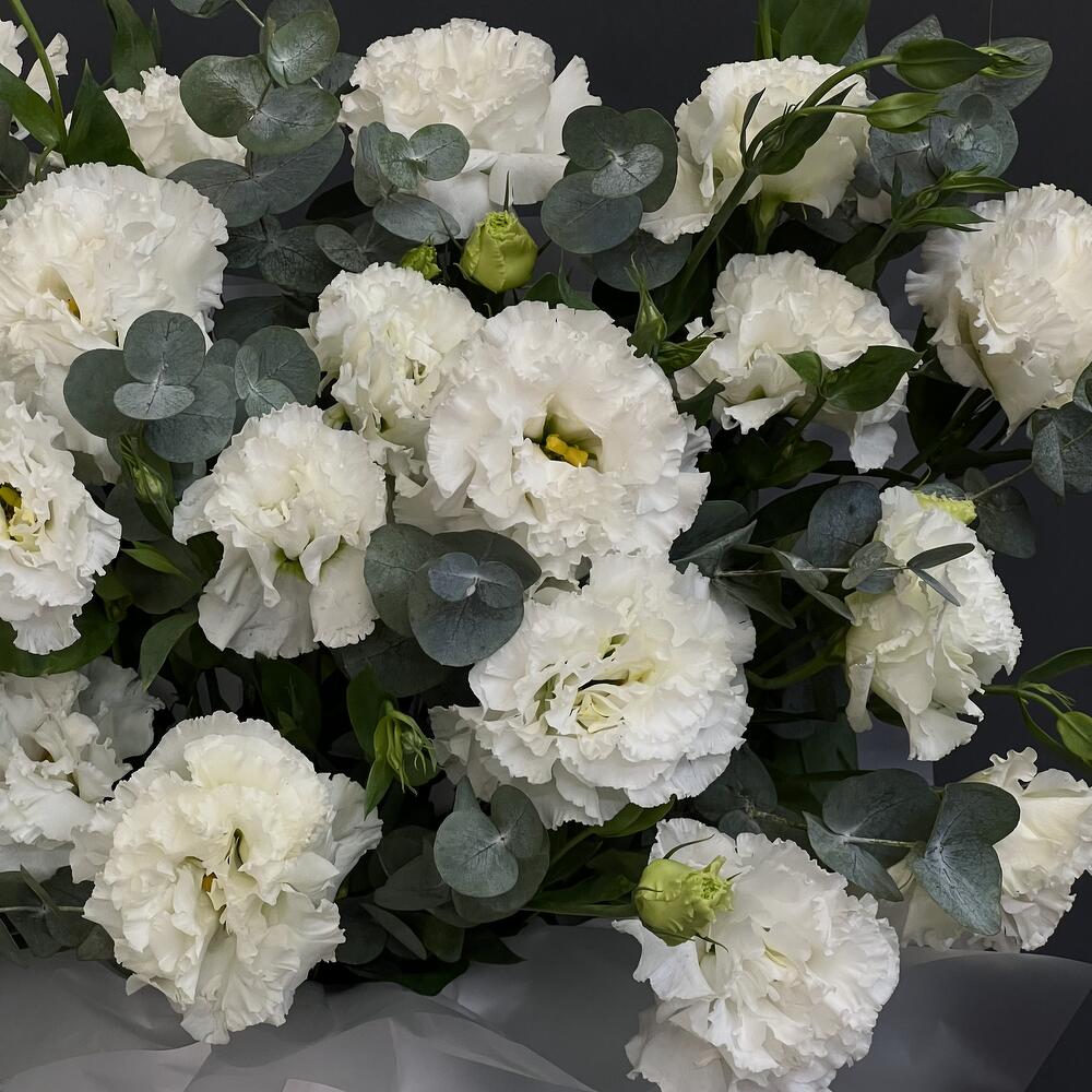Белые Лизиантусы (Эустома) с эвкалиптом в тубусе