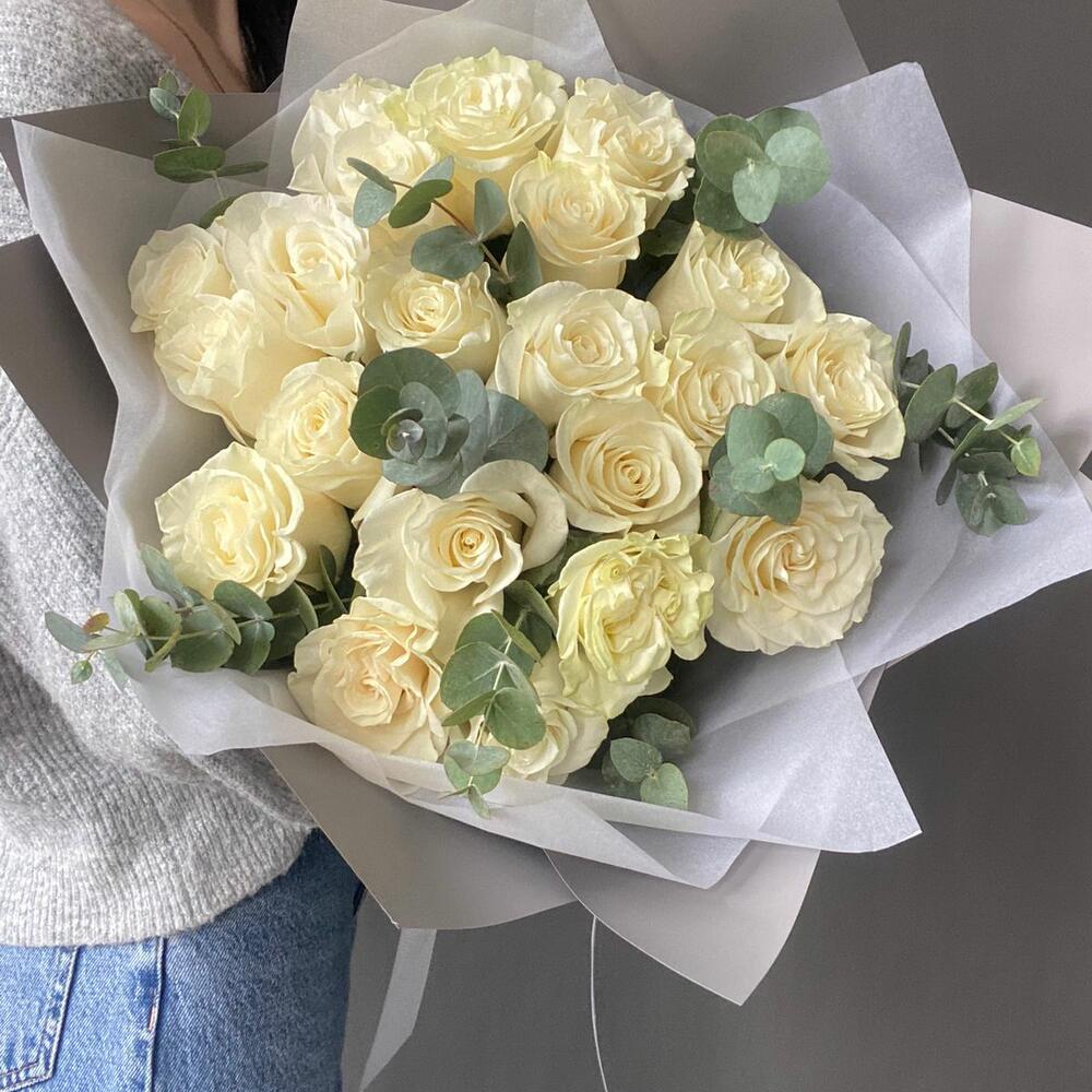 Белые розы 25 шт с эвкалиптом
