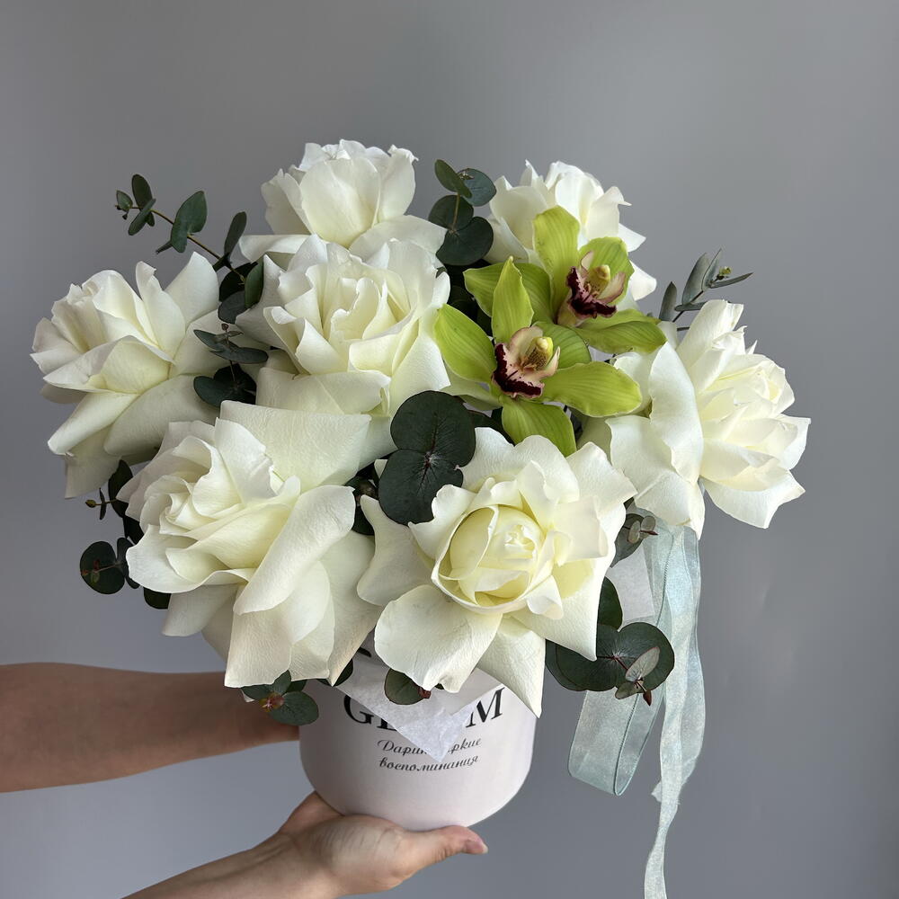 Эвкалипт Цинерея - 1 шт. розы голландские - 7 шт. Орхидеи Цимбидиум Микс - 2 шт.