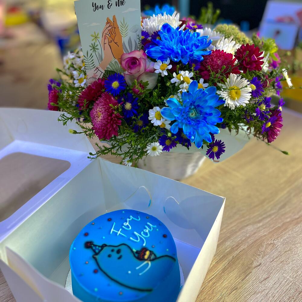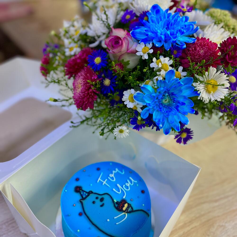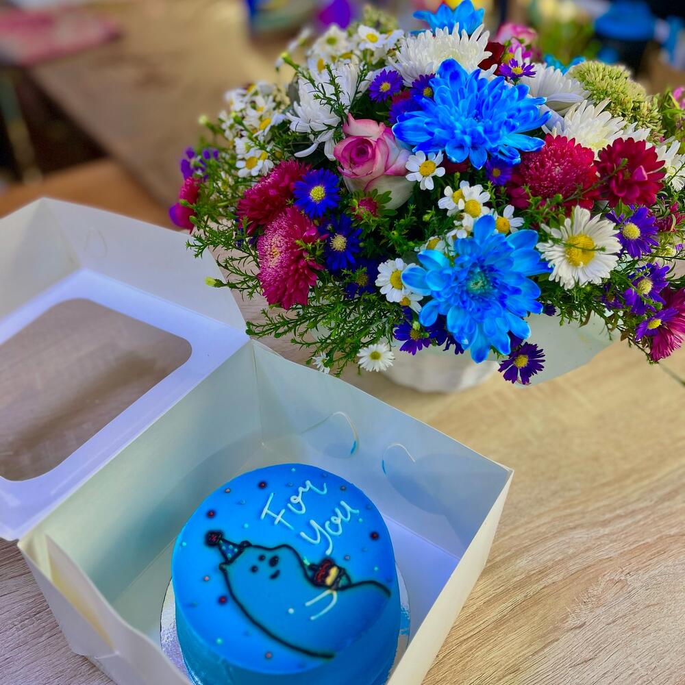 Нежный бенто-тортик в паре с ярким букетом свежих цветов станет идеальным подарком для любого случая. Цветы подарят настроение и уют, а торт наполнит момент сладкими впечатлениями.