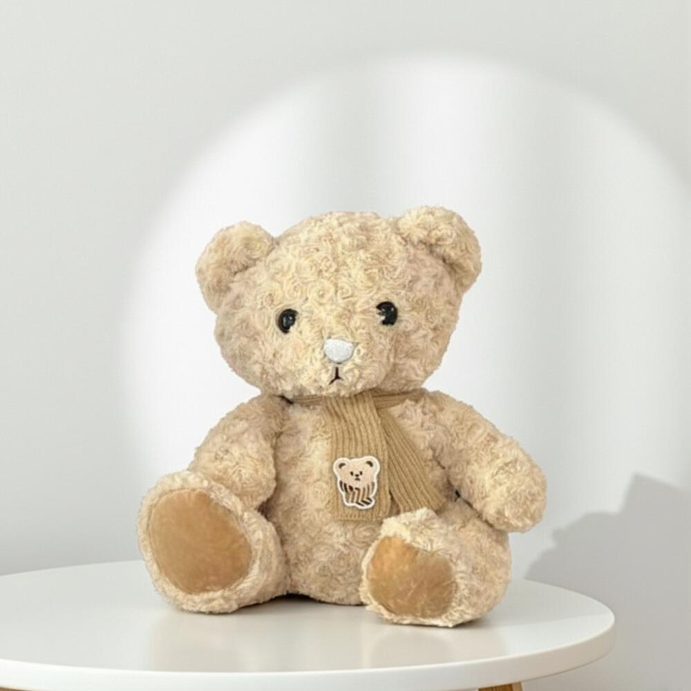 Очаровательный плюшевый мишка нежного бежевого оттенка покоряет с первого взгляда. Его мягкая фактурная шерстка с аккуратными завитками приятна на ощупь и вызывает желание обнять. Стильный шарфик с забавной нашивкой в виде медвежонка добавляет игрушке индивидуальности и делает её ещё более милой. Такой подарок идеально подойдет для детей, любимых людей или в качестве уютного декора для дома. Мишка создаст атмосферу тепла и нежности в любой комнате и станет верным другом для объятий и игр.