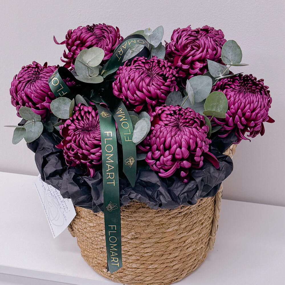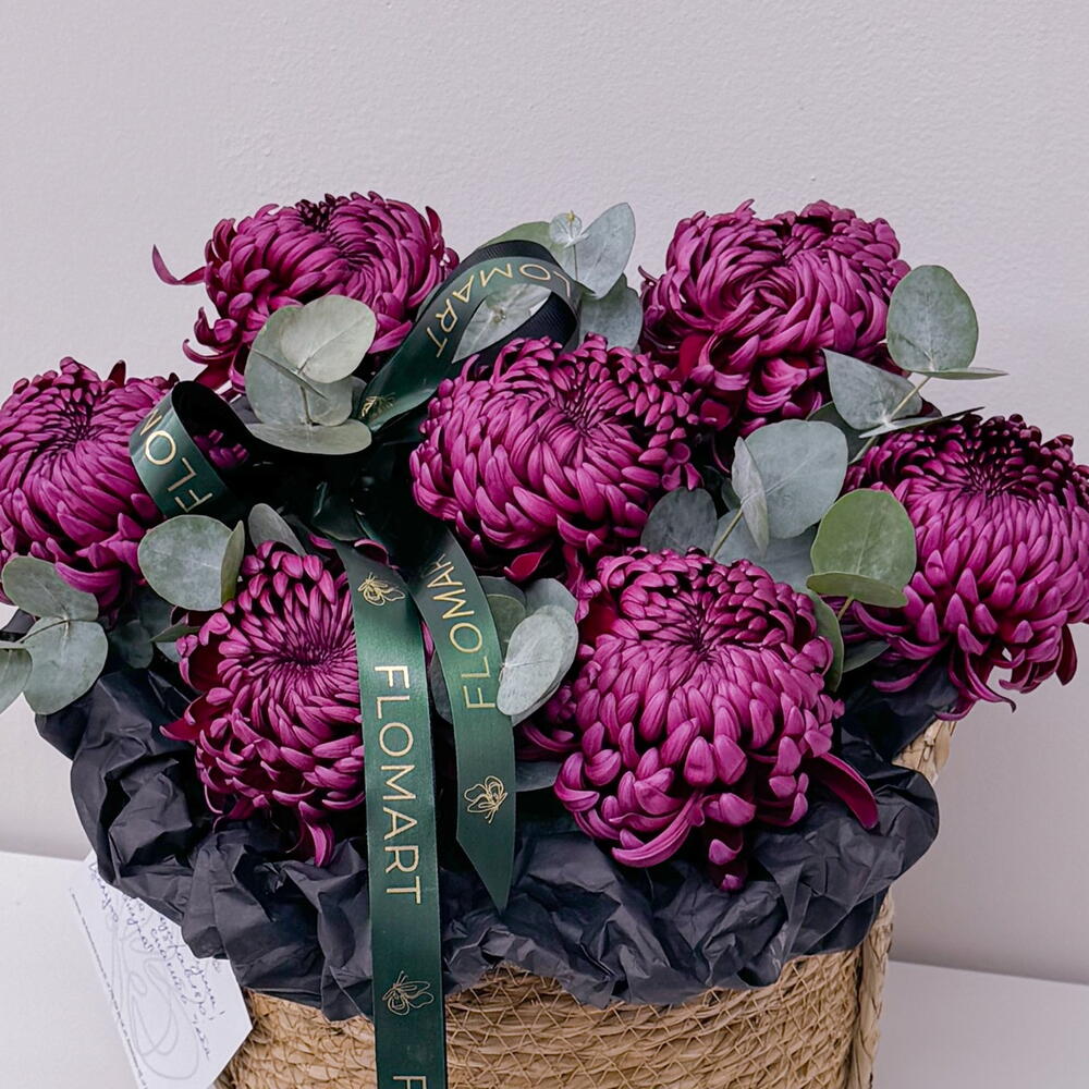 Кашпо - 1 шт. Эвкалипт Цинерея - 1 шт. хризантема бигуди - 7 шт.