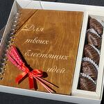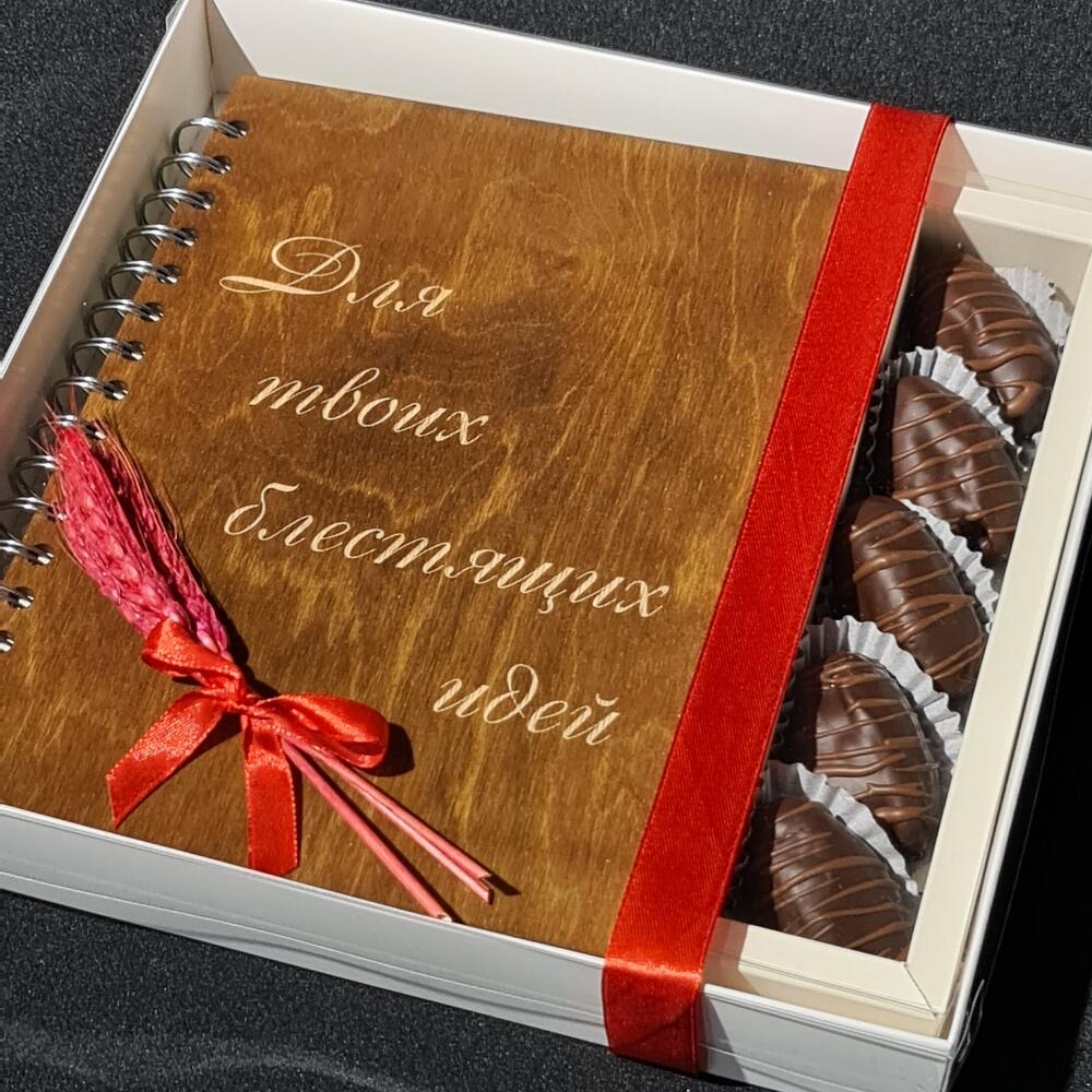 Блестящая идея для подарка! Блокнот ручной работы , обложка выполнена из высококачественной берёзовой фанеры. Королевские финики в бельгийском шоколаде с грецким орехом внутри, станут приятным дополнением. Такой набор подходит для подарка абсолютно всем, ведь в наше время абсолютно все пользуются ежедневниками. Для родных и друзей, доя коллег и учителей, для врачей и тренеров, для мастеров красоты и деловых людей. Дарите полезные подарки, которые будут радовать не один день!