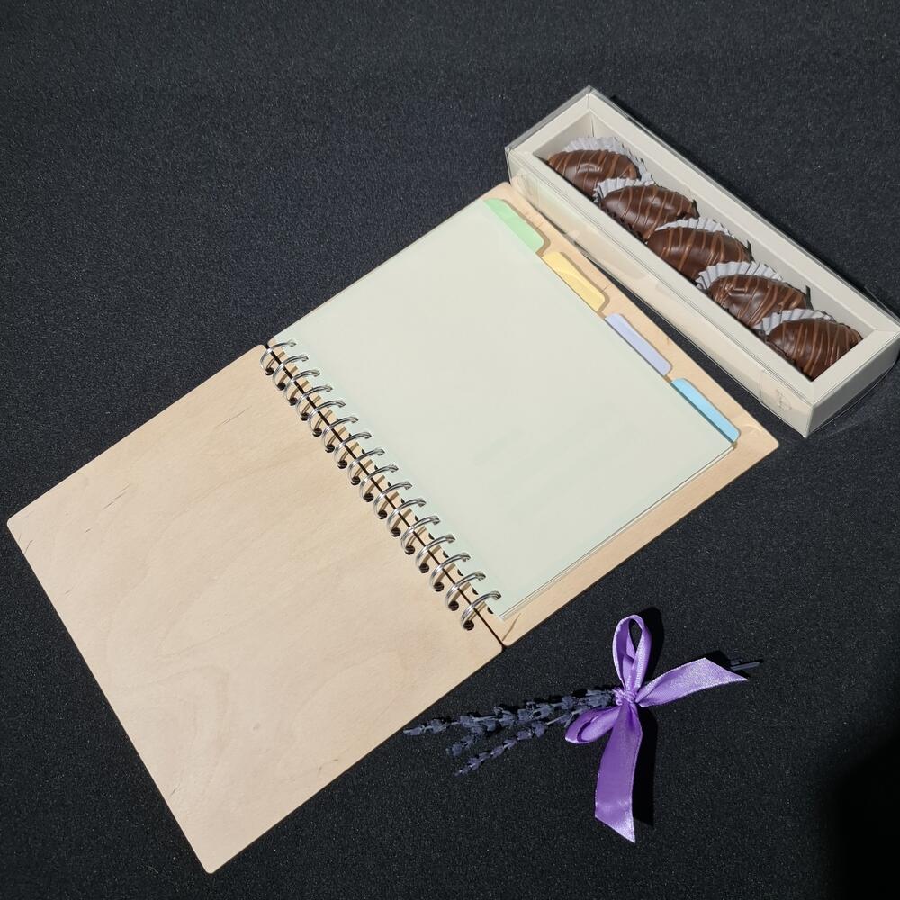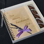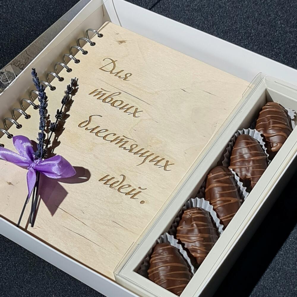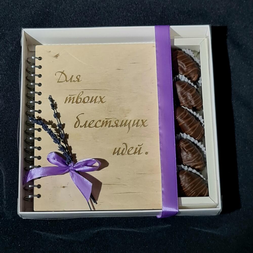 Подарочный набор включает в себя блокнот ручной работы с деревянной обложкой + королевские финики в бельгийском шоколаде и букетик лаванды(можно заменить на колоски).