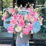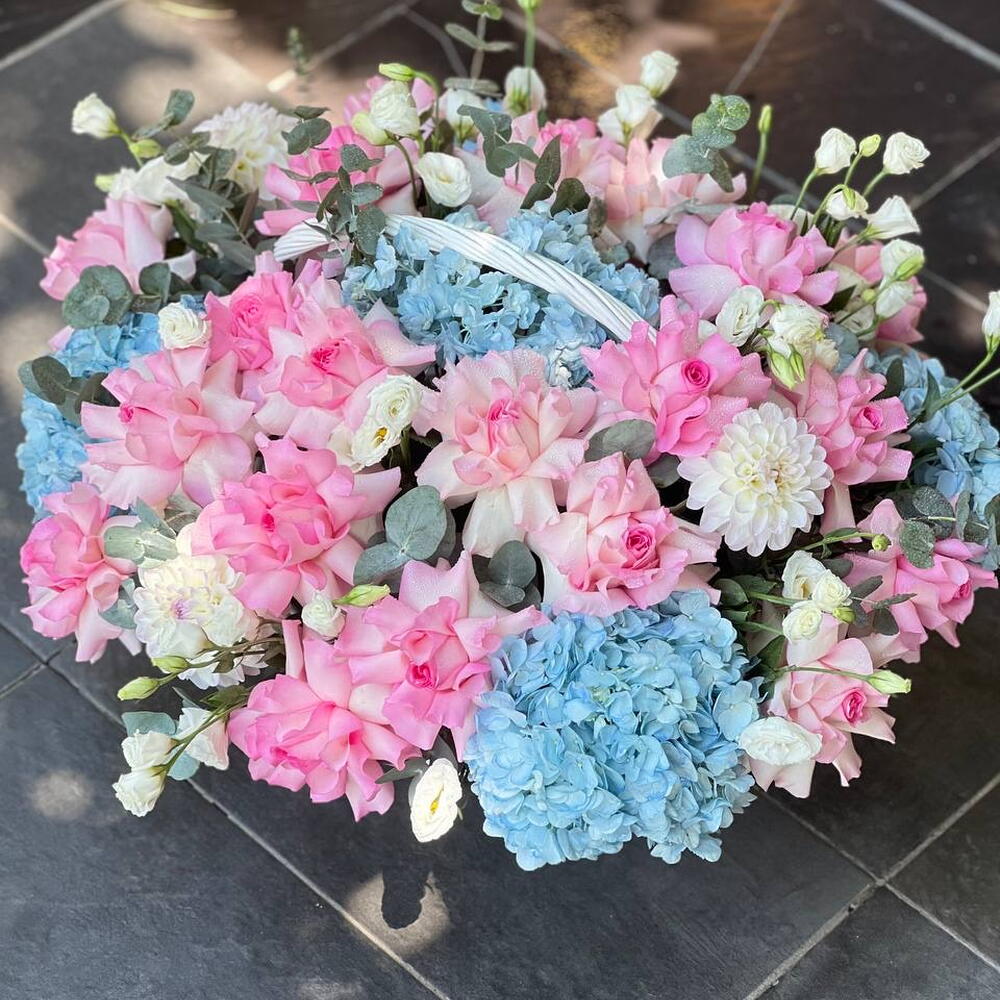 Этот цветочный ансамбль - настоящее воплощение элегантности и гармонии. В состав корзины входит 8 штук нежных лизиантусов, обрамленных 5 кустовыми хризантемами. Зеленые оттенки эукалипта, представленные в количестве 5 штук, придают композиции яркости и свежести. Завершают этот чудесный букет 25 французских роз и 5 гортензий, которые вместе создают образ невероятной нежности и романтики. Идеальный подарок для тех, кто ценит изысканную красоту и изящество.