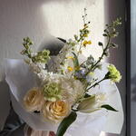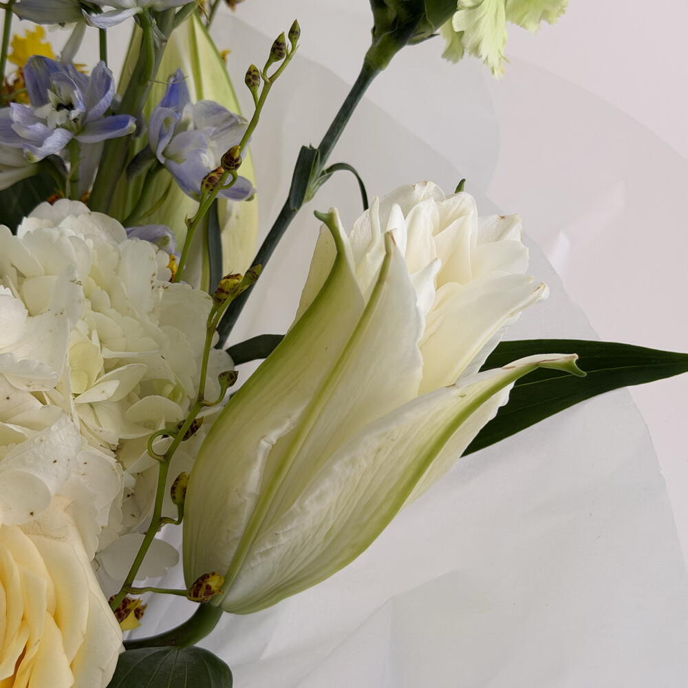 Дельфиниум - 1 шт. Маттиола - 2 шт. Диантус - 3 шт. Лилия Белая - 1 шт. Упаковка дизайнерская - 3 шт. Аквабокс - 1 шт. онцидиум - 1 шт. candy light роза - 2 шт.