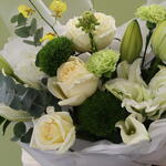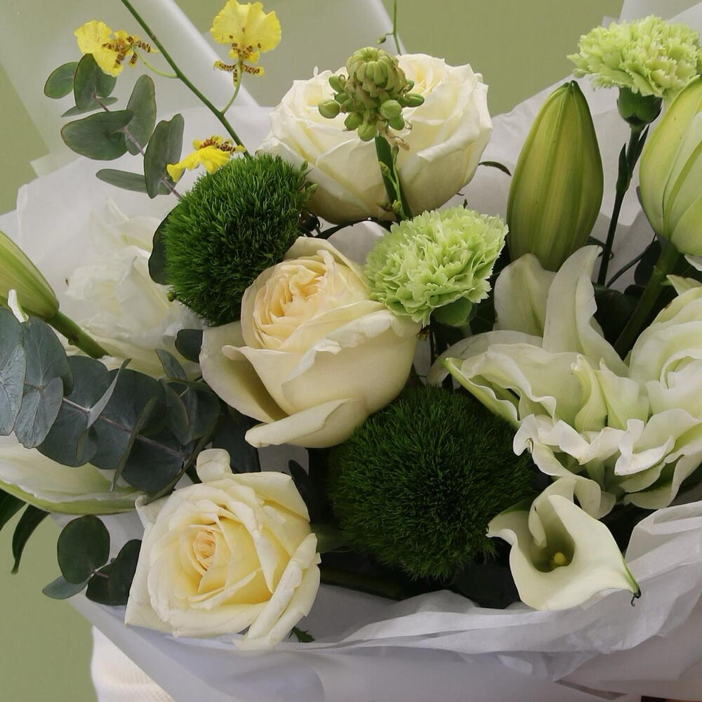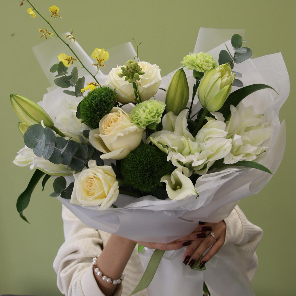 Упаковка - 3 шт. Гвоздика - 4 шт. Лилия Белая - 2 шт. Открыточка с вашими пожеланиями - 1 шт. Эвкалипт Цинерея - 3 шт. инструкция по уходу за цветами - 1 шт. онцидиум желтый - 1 шт. витамины для цветов (кризал) - 1 шт. candy light роза - 3 шт.