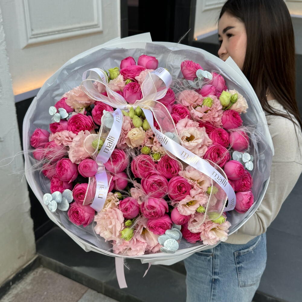 Эустома - 10 шт. Кустовая пионовидная роза - 11 шт. Эвкалипт Цинерея - 10 шт.
