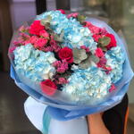 Этот авторский букет станет идеальным подарком, благодаря обворожительному сочетанию благородных роз, ярких гортензий, нежной статицы и свежих листьев эвкалипта. Роскошь 5 роз и их маленьких сестер - 3 спрей-роз образуют сердцевину букета, в то время как 5 гроздей статицы придают ему уникальные магические оттенки. Утонченность композиции подчеркнута тонким ароматом 2 ветвей эвкалипта и мягкостью 5 шаровидных гортензий. Этот букет передаст все многообразие чувств без лишних слов.