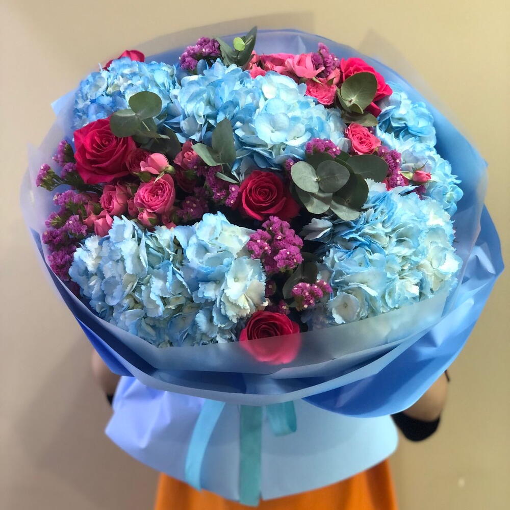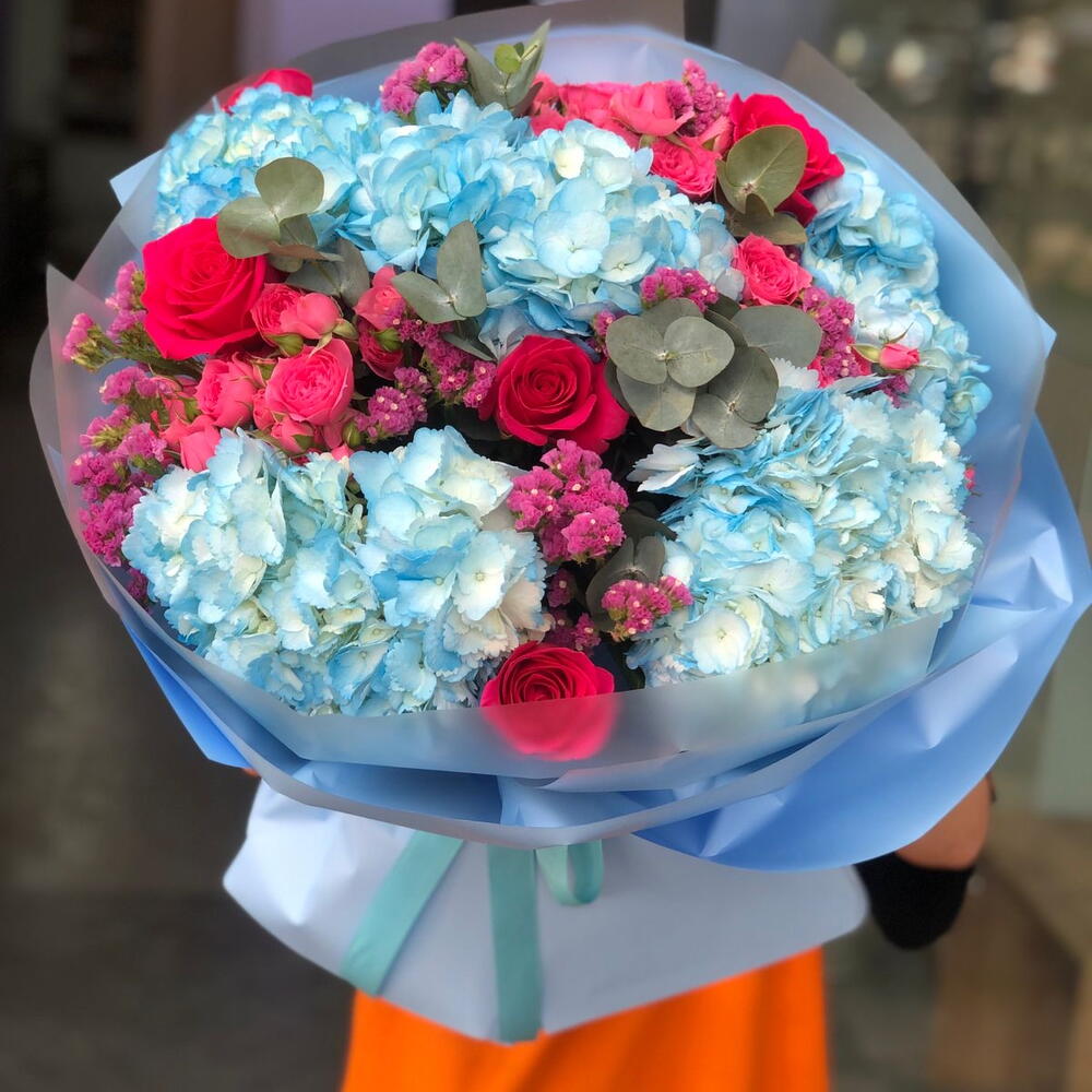 Этот авторский букет станет идеальным подарком, благодаря обворожительному сочетанию благородных роз, ярких гортензий, нежной статицы и свежих листьев эвкалипта. Роскошь 5 роз и их маленьких сестер - 3 спрей-роз образуют сердцевину букета, в то время как 5 гроздей статицы придают ему уникальные магические оттенки. Утонченность композиции подчеркнута тонким ароматом 2 ветвей эвкалипта и мягкостью 5 шаровидных гортензий. Этот букет передаст все многообразие чувств без лишних слов.