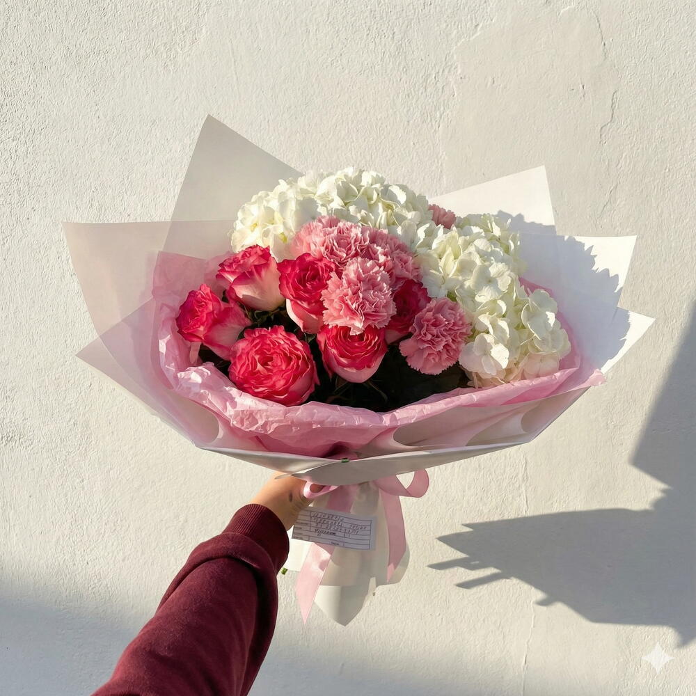 Авторский букет “Богема” — это утончённая композиция, созданная для тех, кто ценит эстетику, стиль и гармонию. В основе букета — 3 пышные гортензии белоснежно-кремового цвета, которые придают объём и мягкость всей композиции. К ним добавлены 5 изысканных роз в насыщенных розовых оттенках и 3 нежных гвоздики, создающих текстурный акцент и подчёркивающих глубину цветовой палитры. Букет выполнен в воздушной розово-белой упаковке, благодаря чему выглядит не только роскошно, но и невероятно лёгко. Такая композиция идеально подойдёт для дня рождения, 8 марта, романтического поздравления, юбилея, выписки из роддома или торжественного события. “Богема” производит впечатление с первого взгляда и станет ярким украшением любого праздника.