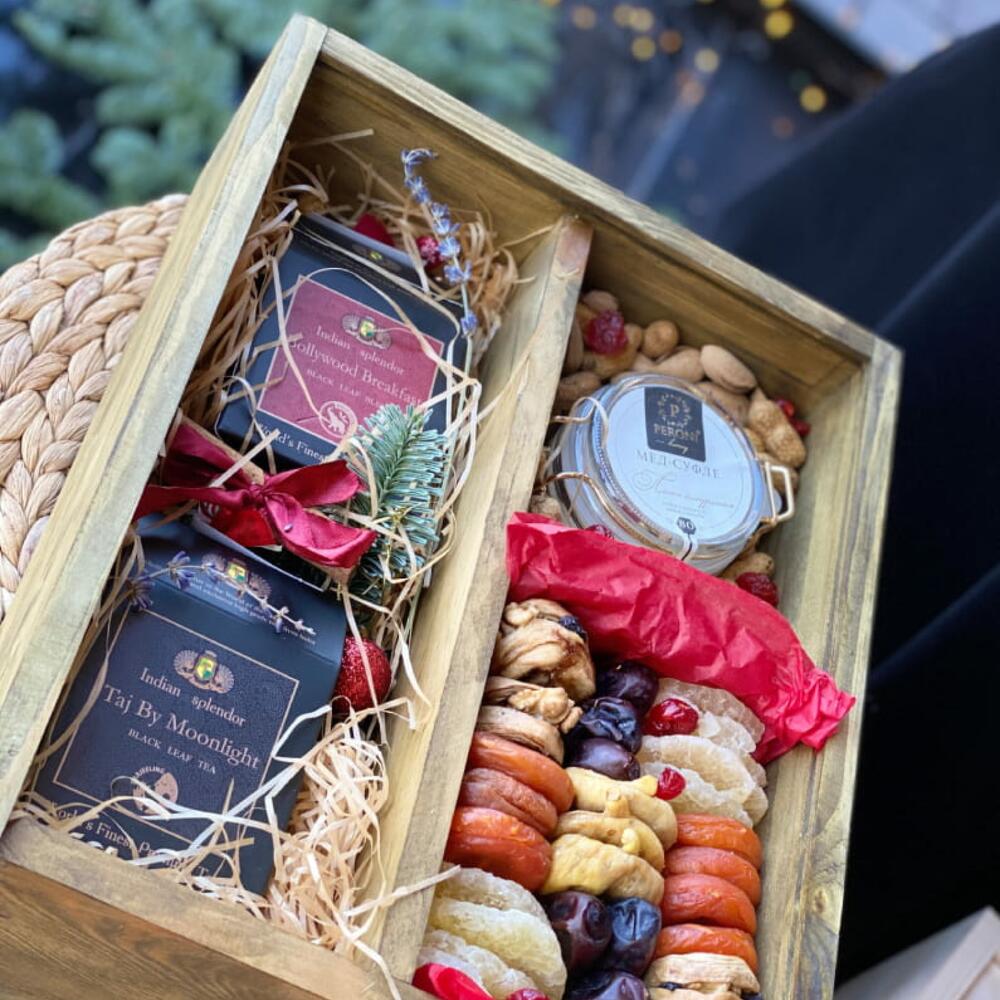 Ананас - 7 шт. Инжир - 3 шт. Мед - 1 шт. Вишня - 2 шт. Чай - 300 гр. Миндаль - 7 шт. Курага - 7 шт. Финики - 7 шт. арахис в кожуре - 10 шт.