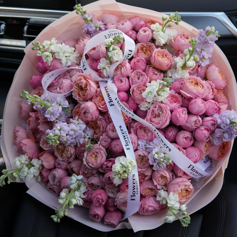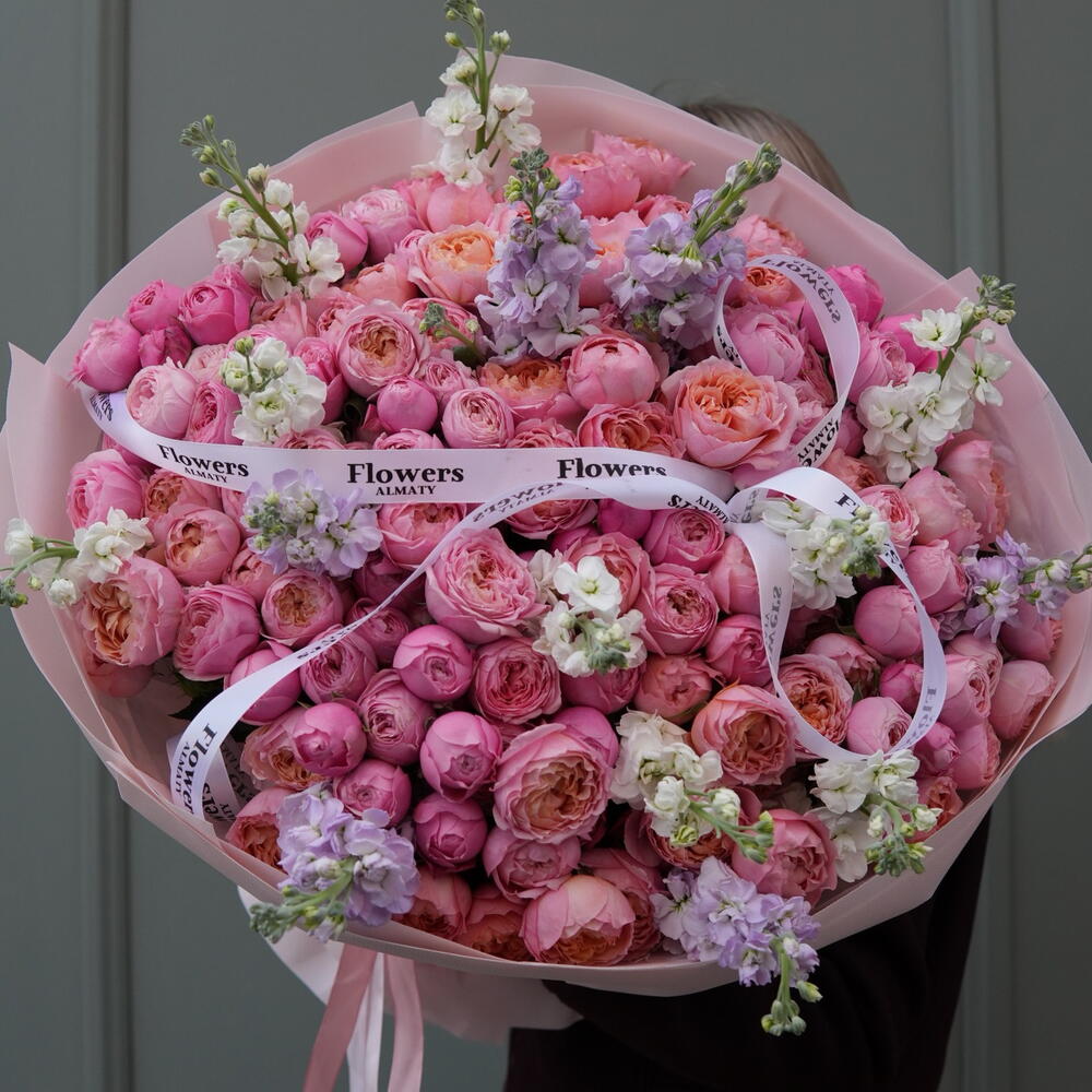 Маттиола - 21 шт. джульетта роза пионовидная кустовая - 51 шт. сильва пинк кустовая роза - 25 шт.