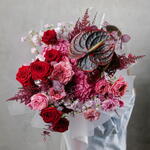 Антуриум - 2 шт. Астильба - 4 шт. Эвкалипт - 3 шт. Эустома - 4 шт. ароматная маттиола - 3 шт. розы - 7 шт. кружевная гортензия - 4 шт. пионовидные розы. - 4 шт.