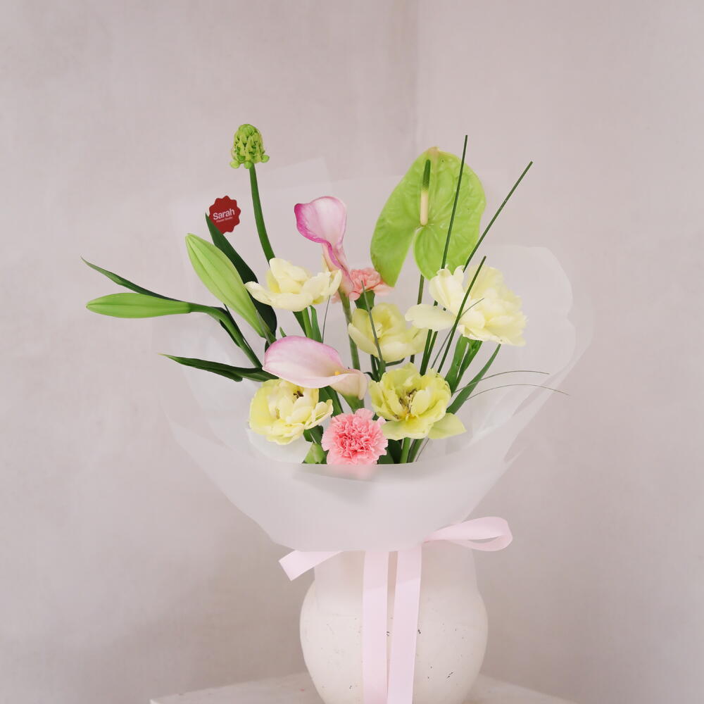 Антуриум - 1 шт. Калла - 2 шт. Лилия - 1 шт. Тюльпан - 5 шт. Гвоздика - 2 шт. Берграсс - 1 шт. Орнитогалум - 1 шт.