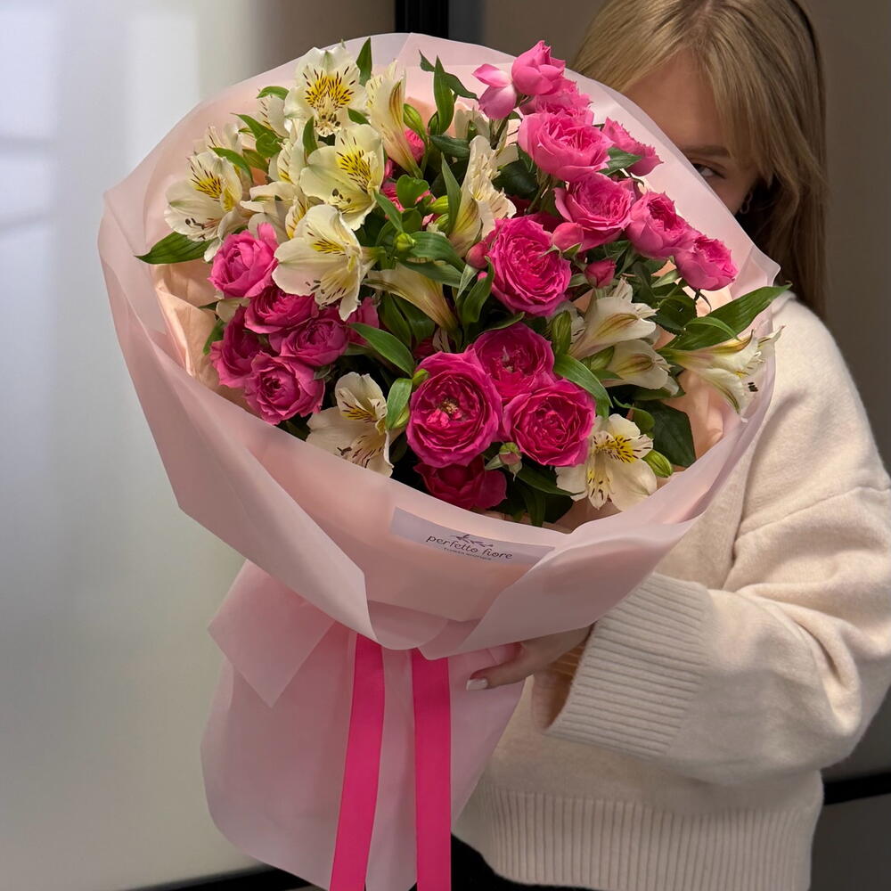 Этот изысканный авторский букет станет настоящим украшением любого праздника или важного события. Сочетание 7 штук нежных альстромерий и 4 кустовых роз наполнит атмосферу неповторимым ароматом и красотой. Самый романтичный и трепетный способ выразить свои чувства.