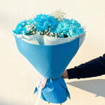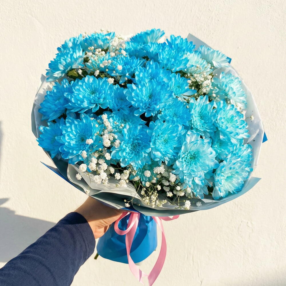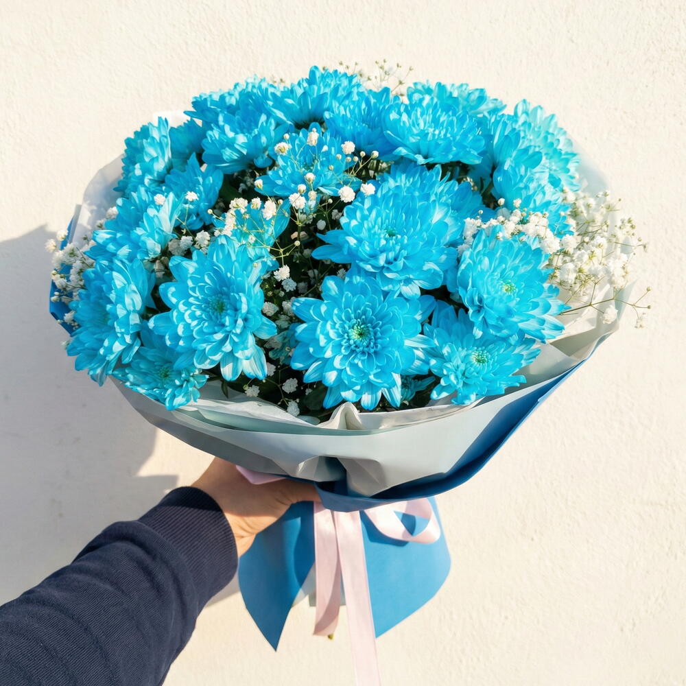 Восхитительный монобукет, выполненный из трех благородных веточек белой гипсофилы и пяти изысканных голубых хризантем кустовой формы Балтика, благодаря которым букет приобретает уникальную форму и объем. Упакованный в эксклюзивную дизайнерскую упаковку с тишью и украшенный элегантной лентой, этот букет станет идеальным подарком для того, чтобы выразить свои чувства и показать искренность своих намерений.