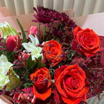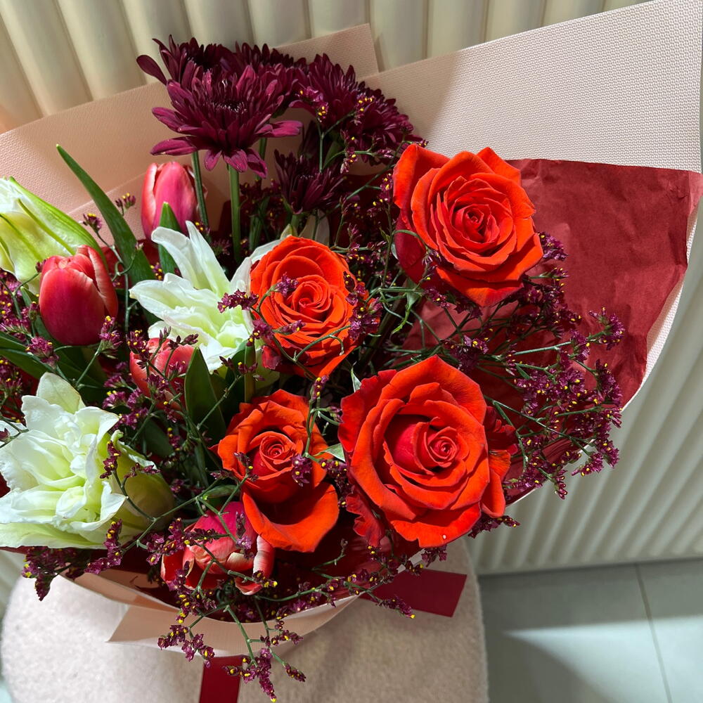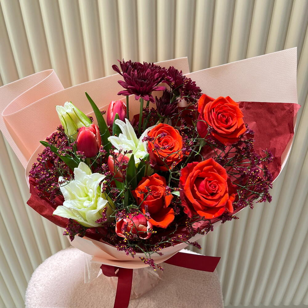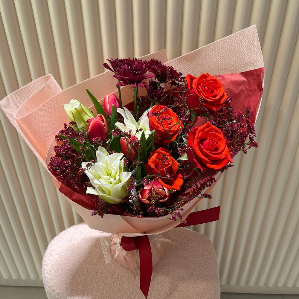 Лилия - 1 шт. Лимониум - 1 шт. Тюльпан - 4 шт. Хризантема кустовая - 1 шт. Роза - 4 шт. переноска для цветов - 1 шт.