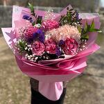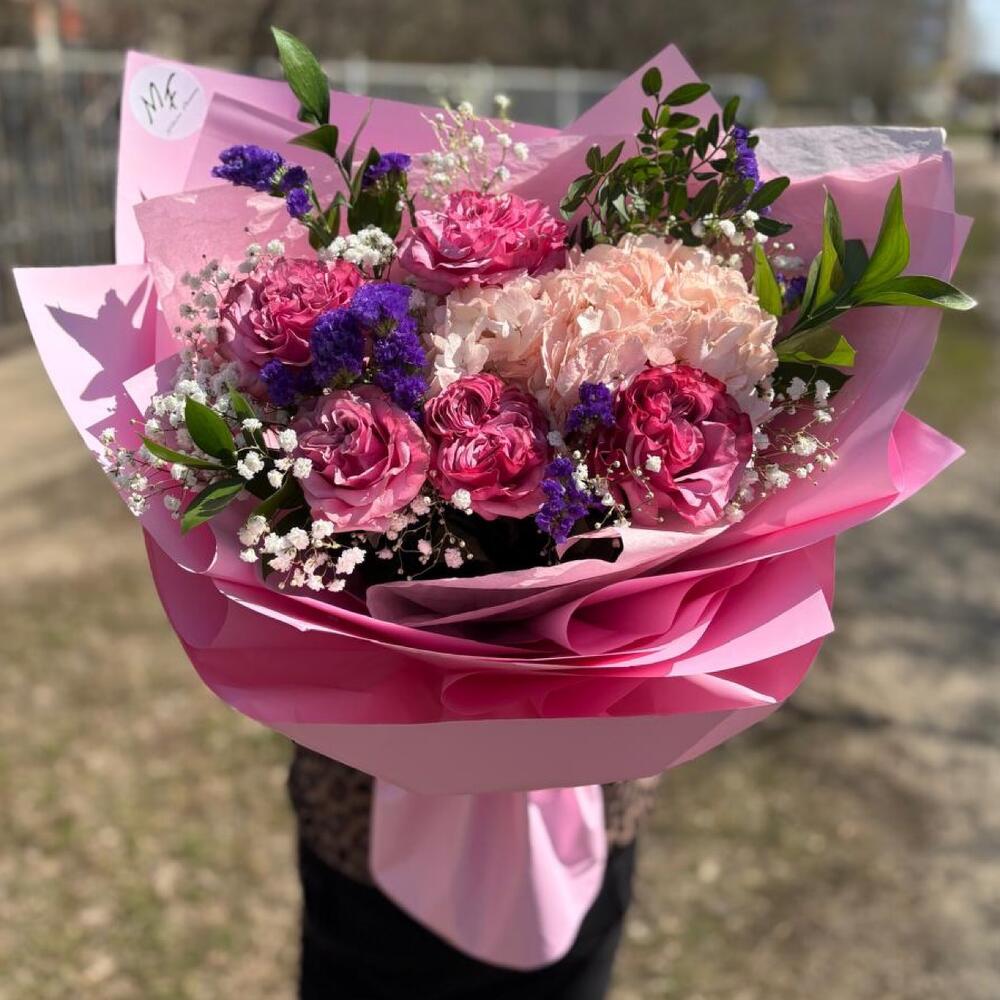 Гипсофила - 1 шт. Писташ - 1 шт. Пионовидная роза - 5 шт. Рускус Италия - 3 шт. Гортензия розовая - 1 шт. Лимониум сиреневый - 1 шт. Оформление матовая пленка - 5 шт.