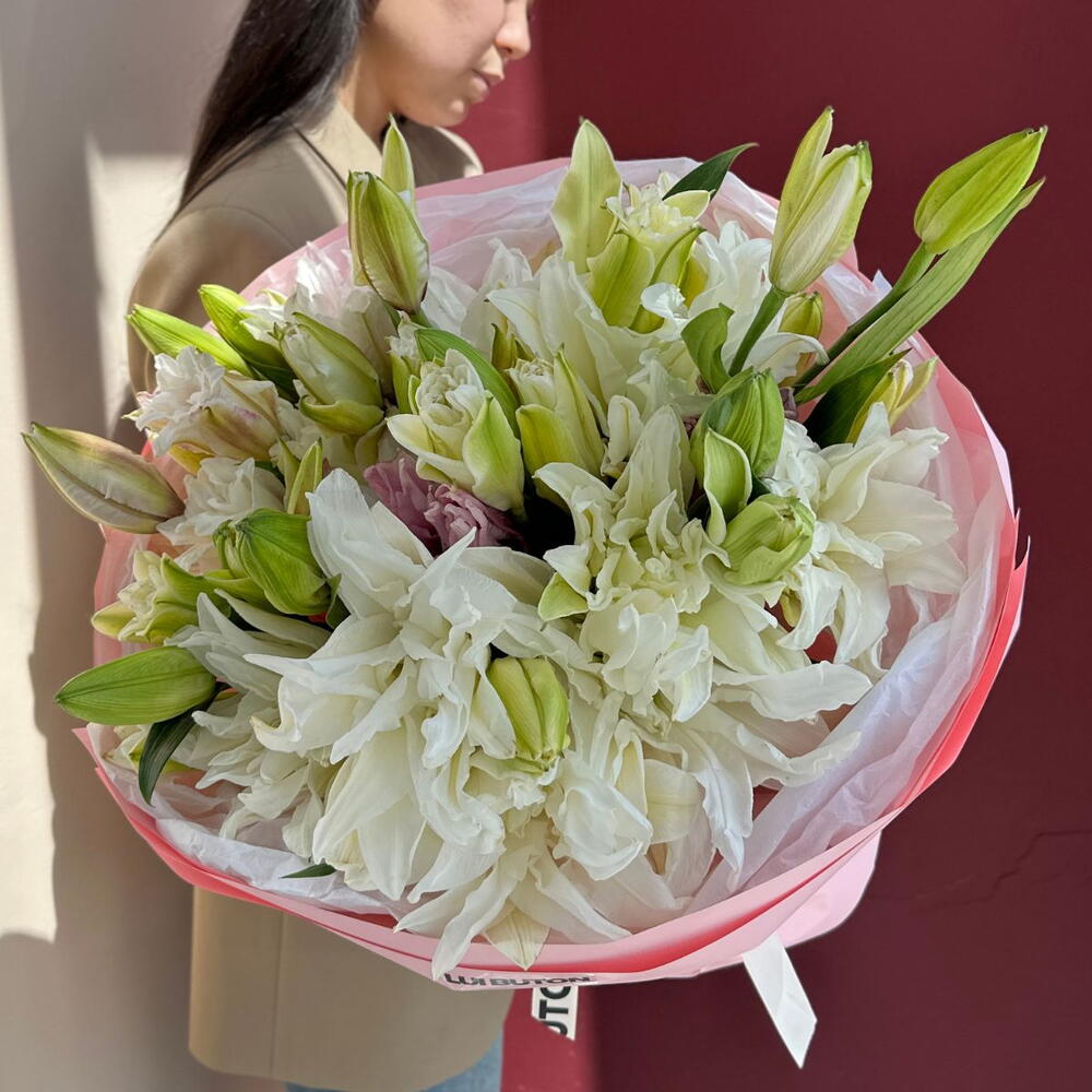 Цветы совсем не соответствуют фотографии которая стоит при заказе. Лилии пришли очень уставшими, с желтыми краями. Буквально в течении 2 часов как их привезли, края лепестков начали засыхать.